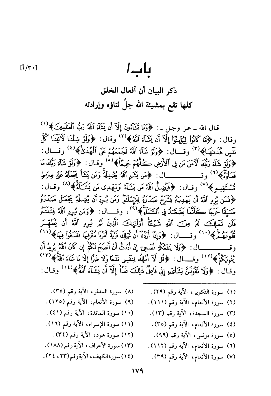 §بَابُ ذِكْرِ الْبَيَانِ أَنَّ أَفْعَالَ الْخَلْقِ كُلَّهَا تَقَعُ بِمَشِيئَةِ اللَّهِ جَلَّ ثَنَاؤُهُ وَإِرَادَتِهِ قَالَ اللَّهُ عَزَّ وَجَلَّ: {وَمَا تَشَاءُونَ إِلَّا أَنْ يَشَاءَ اللَّهُ رَبُّ الْعَالَمِينَ} وَقَالَ: {مَا كَانُوا لِيُؤْمِنُوا إِلَّا أَنْ يَشَاءَ اللَّهُ} [الأنعام: 111] وَقَالَ: {وَلَوْ شِئْنَا لَآتَيْنَا كُلَّ نَفْسٍ هُدَاهَا} [السجدة: 13] وَقَالَ: {وَلَوْ شَاءَ اللَّهُ لَجَمَعَهُمْ عَلَى الْهُدَى} [الأنعام: 35] وَقَالَ: {وَلَوْ شَاءَ رَبُّكَ لَآمَنَ مَنْ فِي الْأَرْضِ كُلُّهُمْ جَمِيعًا} [يونس: 99] وَقَالَ: {وَلَوْ شَاءَ رَبُّكَ مَا فَعَلُوهُ} [الأنعام: 112] وَقَالَ: {مَنْ يَشَإِ اللَّهُ يُضْلِلْهُ وَمَنْ يَشَأْ يَجْعَلْهُ عَلَى صِرَاطٍ مُسْتَقِيمٍ} [الأنعام: 39] وَقَالَ: {فَيُضِلُّ اللَّهُ مَنْ يَشَاءُ وَيَهْدِي مَنْ يَشَاءُ} [إبراهيم: 4] وَقَالَ: {فَمَنْ يُرِدِ اللَّهُ أَنْ يَهْدِيَهُ يَشْرَحْ صَدْرَهُ لِلْإِسْلَامِ وَمَنْ يُرِدْ أَنْ يُضِلَّهُ يَجْعَلْ صَدْرَهُ ضَيِّقًا حَرَجًا كَأَنَّمَا يَصَّعَّدُ فِي السَّمَاءِ} [الأنعام: 125] ، وَقَالَ: {وَمَنْ يُرِدِ اللَّهُ فِتْنَتَهُ فَلَنْ تَمْلِكَ لَهُ مِنَ اللَّهِ شَيْئًا أُولَئِكَ الَّذِينَ لَمْ يُرِدِ اللَّهُ أَنْ يُطَهِّرَ قُلُوبَهُمْ} [المائدة: 41] وَقَالَ: {وَإِذَا أَرَدْنَا أَنْ نُهْلِكَ قَرْيَةً أَمَرْنَا مُتْرَفِيهَا فَفَسَقُوا فِيهَا} [الإسراء: 16] وَقَالَ: {وَلَا يَنْفَعُكُمْ نُصْحِي إِنْ أَرَدْتُ أَنْ أَنْصَحَ لَكُمْ إِنْ كَانَ اللَّهُ يُرِيدُ أَنْ يُغْوِيَكُمْ} [هود: 34] وَقَالَ: {قُلْ لَا أَمْلِكُ لِنَفْسِي نَفْعًا وَلَا ضَرًّا إِلَّا مَا شَاءَ اللَّهُ} [الأعراف: 188] وَقَالَ: {وَلَا تَقُولَنَّ لِشَيْءٍ إِنِّي فَاعِلٌ ذَلِكَ غَدًا إِلَّا أَنْ يَشَاءَ اللَّهُ} [الكهف: 24] وَقَالَ