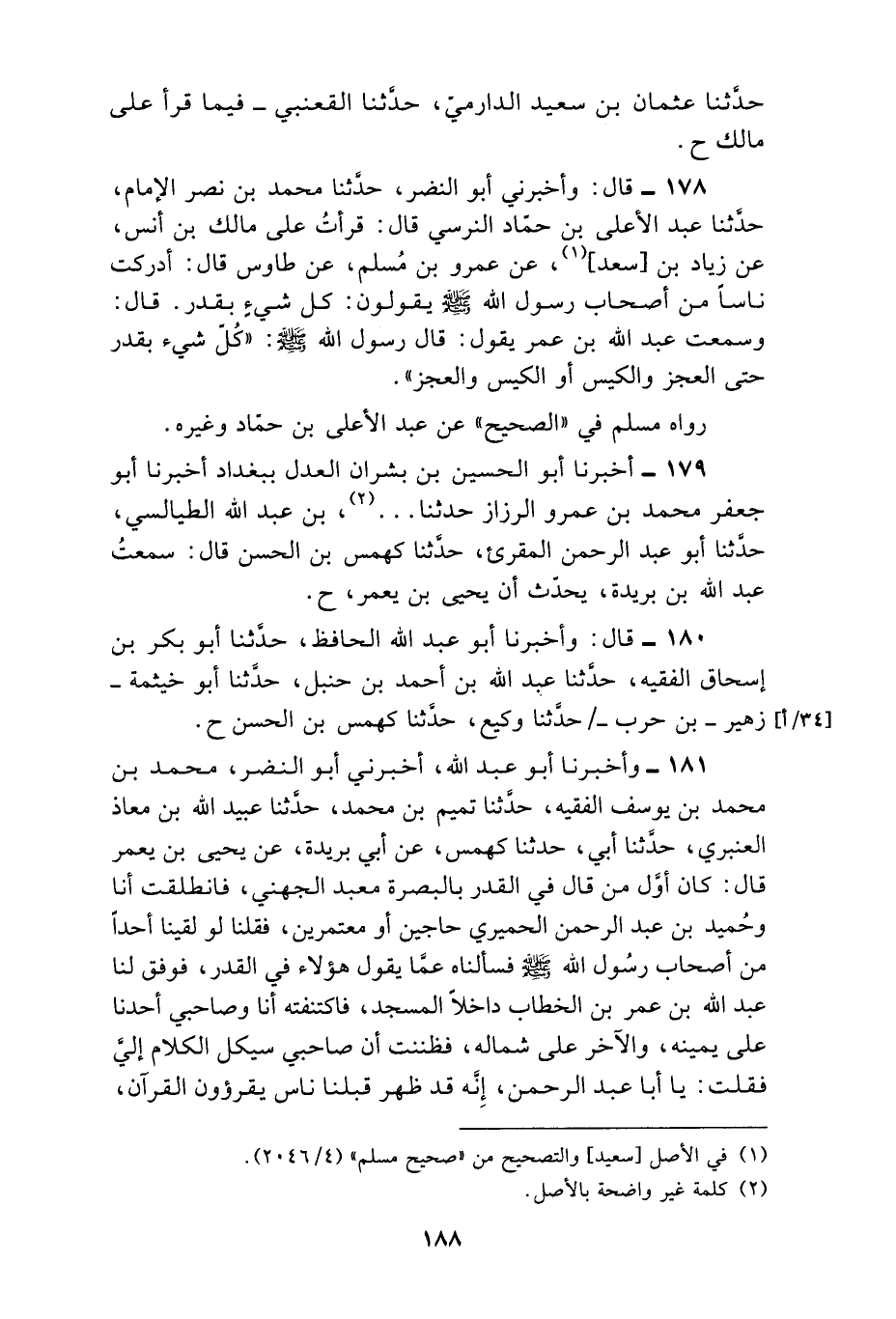 183 - وَأَخْبَرَنَا أَبُو عَلِيٍّ الرُّوذْبَارِيُّ، أَخْبَرَنَا أَبُو بَكْرِ بْنُ دَاسَةَ، حَدَّثَنَا أَبُو دَاوُدَ، حَدَّثَنَا مُسَدَّدٌ، حَدَّثَنَا يَحْيَى، عَنْ عُثْمَانَ بْنِ غِيَاثٍ، قَالَ: حَدَّثَنِي عَبْدُ اللَّهِ بْنُ بُرَيْدَةَ، عَنْ يَحْيَى بْنِ يَعْمَرَ، وَحُمَيْدِ بْنِ عَبْدِ الرَّحْمَنِ، قَالَا: لَقِينَا عَبْدَ اللَّهِ بْنَ عُمَرَ فَذَكَرْنَا لَهُ الْقَدَرَ وَمَا يَقُولُونَ فِيهِ، فَذَكَرَ نَحْوَهُ رَوَاهُ مُسْلِمٌ فِي الصَّحِيحِ عَنْ مُحَمَّدِ بْنِ حَاتِمٍ، عَنْ يَحْيَى بْنِ سَعِيدٍ الْقَطَّانِ ,