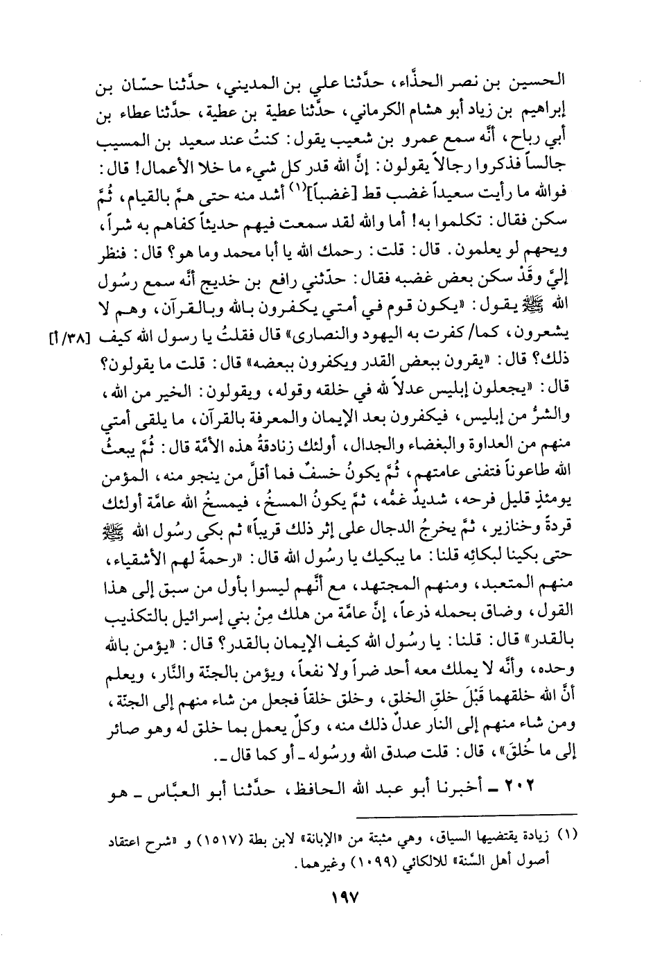 202 - أَخْبَرَنَا أَبُو عَبْدِ اللَّهِ الْحَافِظُ، حَدَّثَنَا أَبُو الْعَبَّاسِ هُوَ -[198]- الْأَصَمُّ، حَدَّثَنَا مُحَمَّدُ بْنُ إِسْحَاقَ الصَّغَانِيُّ، حَدَّثَنِي هَيْثَمُ بْنُ خَارِجَةَ، وَأَبُو أَيُّوبَ قَالَا: حَدَّثَنَا سُلَيْمَانُ بْنُ عُتْبَةَ، عَنْ يُونُسَ بْنِ مَيْسَرَةَ، عَنْ أَبِي إِدْرِيسَ، عَنْ أَبِي الدَّرْدَاءِ، عَنِ النَّبِيِّ صَلَّى اللهُ عَلَيْهِ وَسَلَّمَ قَالَ: «إِنَّ §لِكُلِّ شَيْءٍ حَقِيقَةً، وَمَا بَلَغَ عَبْدٌ حَقِيقَةَ الْإِيمَانِ حَتَّى يَعْلَمَ أَنَّ مَا أَصَابَهُ لَمْ يَكُنْ لِيُخْطِئَهُ، وَمَا أَخْطَأَهُ لَمْ يَكُنْ لِيُصِيبَهُ»