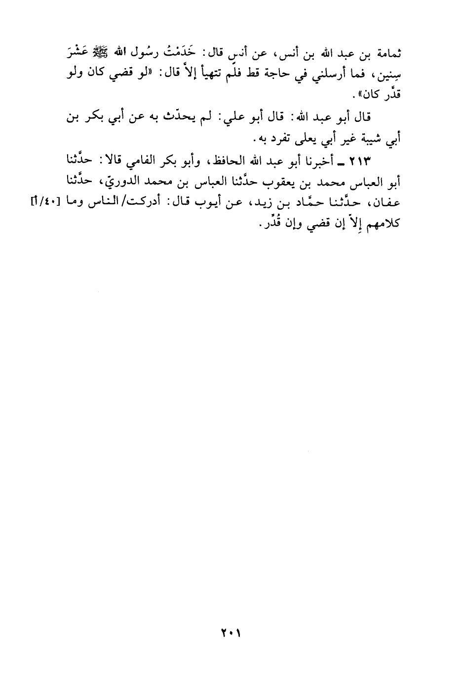 213 - أَخْبَرَنَا أَبُو عَبْدِ اللَّهِ الْحَافِظُ، وَأَبُو بَكْرٍ الْفَامِيُّ قَالَا: حَدَّثَنَا أَبُو الْعَبَّاسِ مُحَمَّدُ بْنُ يَعْقُوبَ، حَدَّثَنَا الْعَبَّاسُ بْنُ مُحَمَّدٍ الدُّورِيُّ، حَدَّثَنَا عَفَّانُ، حَدَّثَنَا حَمَّادُ بْنُ زَيْدٍ، عَنْ أَيُّوبَ، قَالَ: §«أَدْرَكْتُ النَّاسَ وَمَا كَلَامُهُمْ إِلَّا إِنْ قُضِيَ وَإِنْ قُدِّرَ»