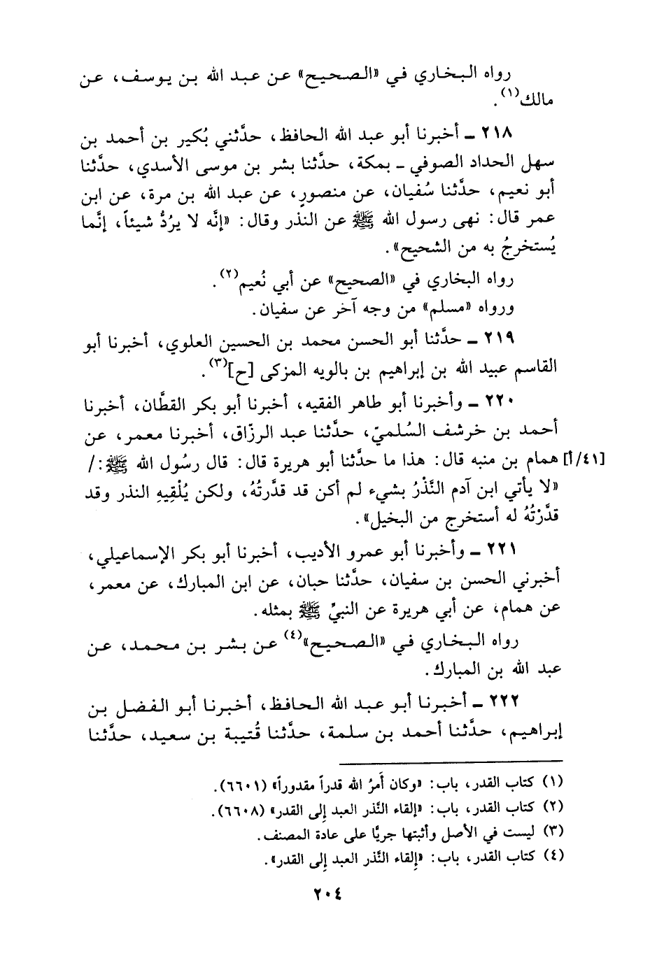 218 - أَخْبَرَنَا أَبُو عَبْدِ اللَّهِ الْحَافِظُ، حَدَّثَنِي بُكَيْرُ بْنُ أَحْمَدَ بْنِ سَهْلٍ الْحَدَّادُ الصُّوفِيُّ، بِمَكَّةَ، حَدَّثَنَا بِشْرُ بْنُ مُوسَى الْأَسَدِيُّ، حَدَّثَنَا أَبُو نُعَيْمٍ، حَدَّثَنَا سُفْيَانُ، عَنْ مَنْصُورٍ، عَنْ عَبْدِ اللَّهِ بْنِ مُرَّةَ، عَنِ ابْنِ عُمَرَ، قَالَ: §نَهَى رَسُولُ اللَّهِ صَلَّى اللهُ عَلَيْهِ وَسَلَّمَ عَنِ النَّذْرِ وَقَالَ: «إِنَّهُ لَا يَرُدُّ شَيْئًا، إِنَّمَا يُسْتَخْرَجُ بِهِ مِنَ الشَّحِيحِ» رَوَاهُ الْبُخَارِيُّ فِي الصَّحِيحِ عَنْ أَبِي نُعَيْمٍ , وَرَوَاهُ مُسْلِمٌ مِنْ وَجْهٍ آخَرَ عَنْ سُفْيَانَ