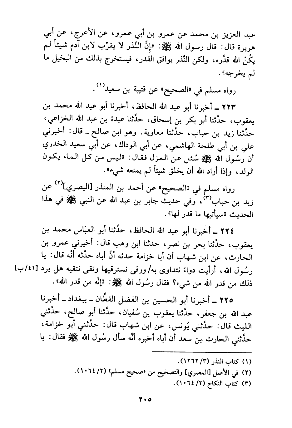 223 - أَخْبَرَنَا أَبُو عَبْدِ اللَّهِ الْحَافِظُ، أَخْبَرَنَا أَبُو عَبْدِ اللَّهِ مُحَمَّدُ بْنُ يَعْقُوبَ، حَدَّثَنَا أَبُو بَكْرِ بْنُ إِسْحَاقَ، حَدَّثَنَا عَبْدَةُ بْنُ عَبْدِ اللَّهِ الْخُزَاعِيُّ، حَدَّثَنَا زَيْدُ بْنُ حُبَابٍ، حَدَّثَنَا مُعَاوِيَةُ وَهُوَ ابْنُ صَالِحٍ قَالَ: أَخْبَرَنِي عَلِيُّ بْنُ أَبِي طَلْحَةَ الْهَاشِمِيُّ، عَنْ أَبِي الْوَدَّاكِ، عَنْ أَبِي سَعِيدٍ الْخُدْرِيِّ، أَنَّ رَسُولَ اللَّهِ صَلَّى اللهُ عَلَيْهِ وَسَلَّمَ سُئِلَ عَنِ الْعَزْلِ فَقَالَ: «§لَيْسَ مِنْ كُلِّ الْمَاءِ يَكُونُ الْوَلَدُ، وَإِذَا أَرَادَ اللَّهُ أَنْ يَخْلُقَ شَيْئًا لَمْ يَمْنَعْهُ شَيْءٌ» رَوَاهُ مُسْلِمٌ فِي الصَّحِيحِ عَنْ أَحْمَدَ بْنِ الْمُنْذِرِ الْبَصْرِيِّ، عَنْ زَيْدِ بْنِ حُبَابٍ وَفِي حَدِيثِ جَابِرِ بْنِ عَبْدِ اللَّهِ عَنِ النَّبِيِّ صَلَّى اللهُ عَلَيْهِ وَسَلَّمَ فِي هَذَا الْحَدِيثِ «سَيَأْتِيهَا مَا قُدِّرَ لَهَا»