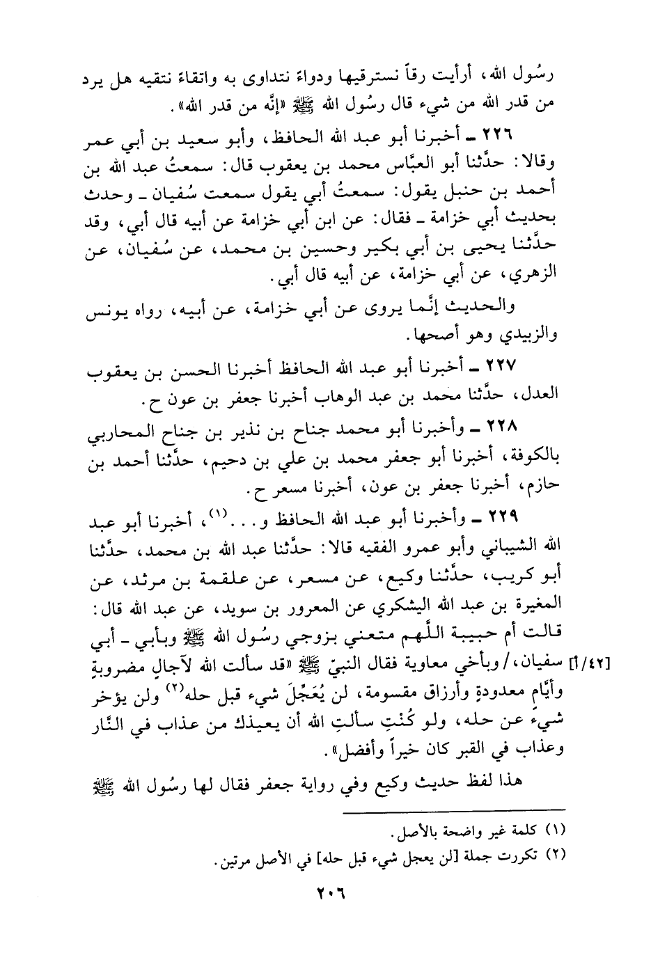 229 - وَأَخْبَرَنَا أَبُو عَبْدِ اللَّهِ الْحَافِظُ، وَ. . . . أَخْبَرَنَا أَبُو عَبْدِ اللَّهِ الشَّيْبَانِيُّ، وَأَبُو عَمْرٍو الْفَقِيهُ قَالَا: حَدَّثَنَا عَبْدُ اللَّهِ بْنُ مُحَمَّدٍ، حَدَّثَنَا أَبُو كُرَيْبٍ حَدَّثَنَا وَكِيعٌ عَنْ مِسْعَرٍ عَنْ عَلْقَمَةَ بْنِ مَرْثَدٍ عَنِ الْمُغِيرَةُ بْنُ عَبْدِ اللَّهِ الْيَشْكُرِيُّ، عَنِ الْمَعْرُورِ بْنِ سُوَيْدٍ، عَنْ عَبْدِ اللَّهِ، قَالَ: قَالَتْ أُمُّ حَبِيبَةَ: اللَّهُمَّ مَتِّعْنِي بِزَوْجِي رَسُولِ اللَّهِ صَلَّى اللهُ عَلَيْهِ وَسَلَّمَ وَبِأَبِي أَبِي سُفْيَانَ، وَبِأَخِي مُعَاوِيَةَ فَقَالَ النَّبِيُّ صَلَّى اللهُ عَلَيْهِ وَسَلَّمَ: «§قَدْ سَأَلْتِ اللَّهَ لِآجَالٍ مَضْرُوبَةٍ وَأَيَّامٍ مَعْدُودَةٍ وَأَرْزَاقٍ مَقْسُومَةٍ، لَنْ يُعَجَّلَ شَيْءٌ قَبْلَ حِلِّهِ وَلَنْ يُؤَخَّرَ شَيْءٌ عَنْ حِلِّهِ، وَلَوْ كُنْتِ سَأَلْتِ اللَّهَ أَنْ يُعِيذَكِ مِنْ عَذَابٍ فِي النَّارِ، وَعَذَابٍ فِي الْقَبْرِ كَانَ خَيْرًا وَأَفْضَلَ» هَذَا لَفْظُ حَدِيثِ وَكِيعٍ وَفِي رِوَايَةِ جَعْفَرٍ فَقَالَ لَهَا رَسُولُ اللَّهِ صَلَّى اللهُ عَلَيْهِ وَسَلَّمَ -[207]-: «إِنَّكِ دَعَوْتِ اللَّهَ لِآجَالٍ مَعْلُومَةٍ وَأَرْزَاقٍ مَقْسُومَةٍ وَآثَارٍ مَبْلُوغَةٍ، لَا يُعَجَّلُ شَيْءٌ مِنْهَا قَبْلَ حِلِّهَا وَلَا يُؤَخَّرُ شَيْءٌ مِنْهَا بَعْدَ حِلِّهَا فَلَوْ دَعَوْتِ اللَّهَ أَنْ يُعَافِيَكِ أَوْ سَأَلْتِ اللَّهَ أَنْ يُعِيذَكِ أَوْ يُعَافِيَكِ مِنْ عَذَابٍ فِي النَّارِ أَوْ عَذَابٍ فِي الْقَبْرِ لَكَانَ خَيْرًا أَوْ كَانَ أَفْضَلَ» رَوَاهُ مُسْلِمٌ فِي الصَّحِيحِ عَنْ أَبِي كُرَيْبٍ