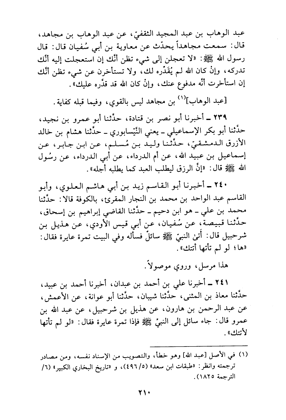 239 - أَخْبَرَنَا أَبُو نَصْرِ بْنُ قَتَادَةَ , حَدَّثَنَا أَبُو عَمْرِو بْنُ نُجَيْدٍ , حَدَّثَنَا أَبُو بَكْرٍ الْإِسْمَاعِيلِيُّ يَعْنِي النَّيْسَابُورِيَّ , حَدَّثَنَا هِشَامُ بْنُ خَالِدٍ الْأَزْرَقُ الدِّمَشْقِيُّ , حَدَّثَنَا وَلِيدُ بْنُ مُسْلِمٍ , عَنِ ابْنِ جَابِرٍ , عَنْ إِسْمَاعِيلَ بْنِ عُبَيْدِ اللَّهِ , عَنْ أُمِّ الدَّرْدَاءِ , عَنْ أَبِي الدَّرْدَاءِ , عَنْ رَسُولِ اللَّهِ صَلَّى اللهُ عَلَيْهِ وَسَلَّمَ قَالَ: «إِنَّ §الرِّزْقَ لَيَطْلُبُ الْعَبْدَ كَمَا يَطْلُبُهُ أَجَلُهُ»