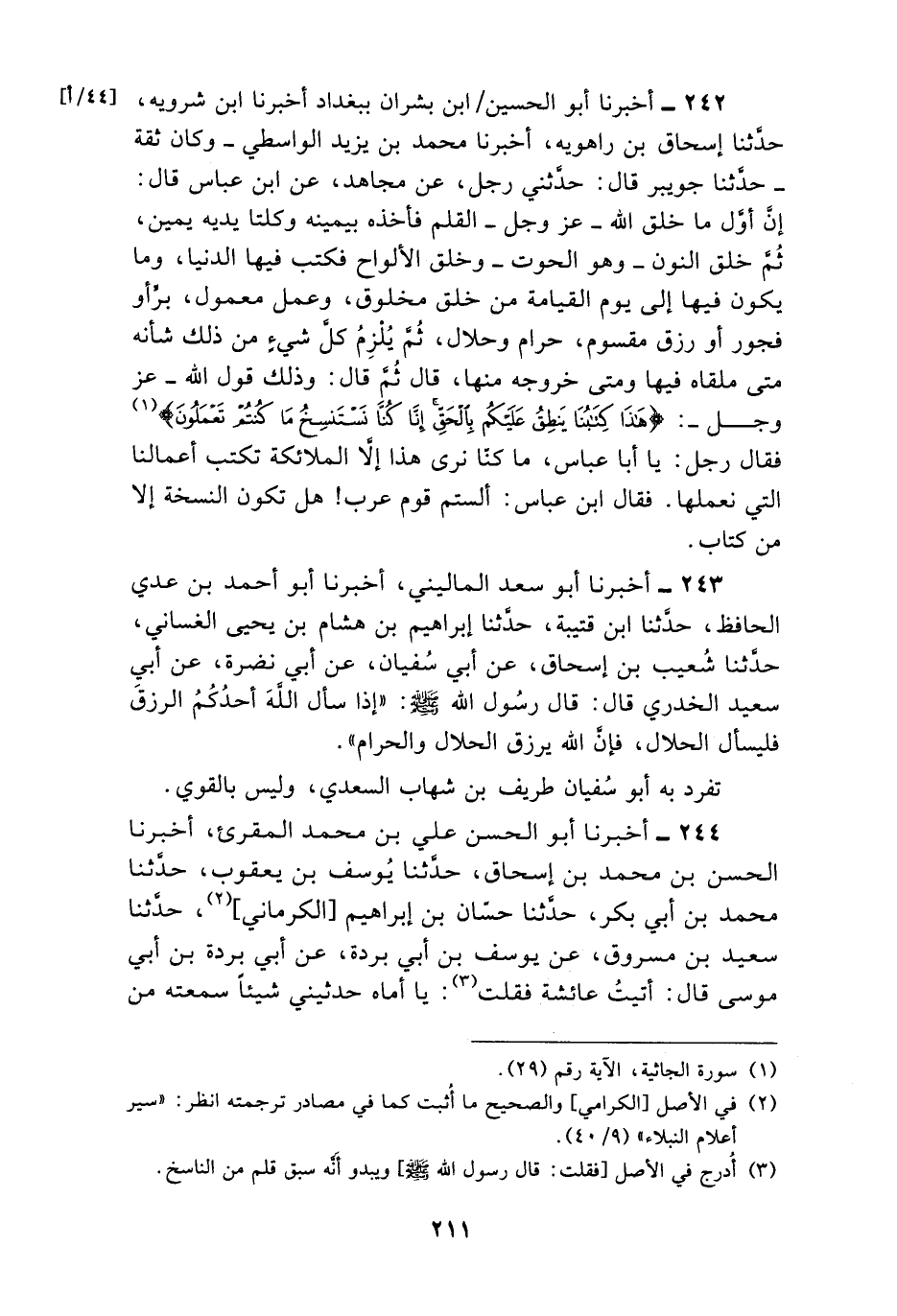242 - أَخْبَرَنَا أَبُو الْحُسَيْنِ بْنُ بِشْرَانَ , بِبَغْدَادَ , أَخْبَرَنَا ابْنُ شِرَوَيْهِ , حَدَّثَنَا إِسْحَاقُ بْنُ رَاهَوَيْهِ , أَخْبَرَنَا مُحَمَّدُ بْنُ يَزِيدَ الْوَاسِطِيُّ , وَكَانَ ثِقَةً , حَدَّثَنَا جُوَيْبِرٌ , قَالَ: حَدَّثَنِي رَجُلٌ , عَنْ مُجَاهِدٍ , عَنِ ابْنِ عَبَّاسٍ , قَالَ: «إِنَّ §أَوَّلَ مَا خَلَقَ اللَّهُ عَزَّ وَجَلَّ الْقَلَمُ فَأَخَذَهُ بِيَمِينِهِ وَكِلْتَا يَدَيْهِ يَمِينٌ , ثُمَّ خَلَقَ النُّونَ وَهُوَ الْحُوتُ , وَخَلَقَ الْأَلْوَاحَ فَكَتَبَ فِيهَا الدُّنْيَا وَمَا يَكُونُ فِيهَا إِلَى يَوْمِ الْقِيَامَةِ مِنْ خَلْقٍ مَخْلُوقٍ , وَعَمَلٍ مَعْمُولٍ , بِرٍّ أَوْ فُجُورٍ , أَوْ رِزْقٍ مَقْسُومٍ , حَرَامٍ وَحَلَالٍ , ثُمَّ يُلْزِمُ كُلَّ شَيْءٍ مِنْ ذَلِكَ شَأْنَهُ مَتَى مَلْقَاهُ فِيهَا وَمَتَى خُرُوجُهُ مِنْهَا» قَالَ: ثُمَّ قَالَ: " وَذَلِكَ قَوْلُ اللَّهِ عَزَّ وَجَلَّ: {هَذَا كِتَابُنَا يَنْطِقُ عَلَيْكُمْ بِالْحَقِّ إِنَّا كُنَّا نَسْتَنْسِخُ مَا كُنْتُمْ تَعْمَلُونَ} [الجاثية: 29] " فَقَالَ رَجُلٌ: يَا أَبَا عَبَّاسٍ مَا كُنَّا نَرَى هَذَا إِلَّا الْمَلَائِكَةَ تَكْتُبُ أَعْمَالَنَا الَّتِي نَعْمَلُهَا. فَقَالَ ابْنُ عَبَّاسٍ: «أَلَسْتُمْ قَوْمًا عَرَبًا هَلْ تَكُونُ النُّسْخَةُ إِلَّا مِنْ كِتَابٍ»