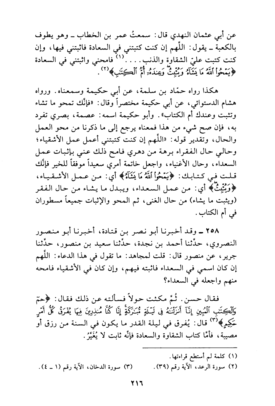 258 - وَقَدْ أَخْبَرَنَا أَبُو نَصْرِ بْنُ قَتَادَةَ , أَخْبَرَنَا أَبُو مَنْصُورٍ النَّصْرَوِيُّ , حَدَّثَنَا أَحْمَدُ بْنُ نَجْدَةَ , حَدَّثَنَا سَعِيدُ بْنُ مَنْصُورٍ , حَدَّثَنَا جَرِيرٌ , عَنْ مَنْصُورٍ , قَالَ: قُلْتُ لِمُجَاهِدٍ: مَا تَقُولُ فِي هَذَا الدُّعَاءِ: اللَّهُمَّ إِنْ كَانَ اسْمِي فِي السُّعَدَاءِ فَاثْبِتْهُ فِيهِمْ , وَإِنْ كَانَ فِي الْأَشْقِيَاءِ فَامْحُهُ مِنْهُمْ وَاجْعَلْهُ فِي السُّعَدَاءِ؟ فَقَالَ: «حَسَنٌ» ثُمَّ مَكَثْتُ حَوْلًا فَسَأَلْتُهُ عَنْ ذَلِكَ فَقَالَ: " {§حم وَالْكِتَابِ الْمُبِينِ إِنَّا أَنْزَلْنَاهُ فِي لَيْلَةٍ مُبَارَكَةٍ إِنَّا كُنَّا مُنْذِرِينَ فِيهَا يُفَرَقُ كُلُّ أَمْرٍ حَكِيمٍ} [الدخان: 2] قَالَ: يُفَرَقُ فِي لَيْلَةِ الْقَدْرِ مَا يَكُونُ فِي السَّنَةِ مِنْ رِزْقٍ أَوْ مُصِيبَةٍ , فَأَمَّا كِتَابُ الشَّقَاوَةِ وَالسَّعَادَةِ فَإِنَّهُ ثَابِتٌ لَا يُغَيَّرُ "
