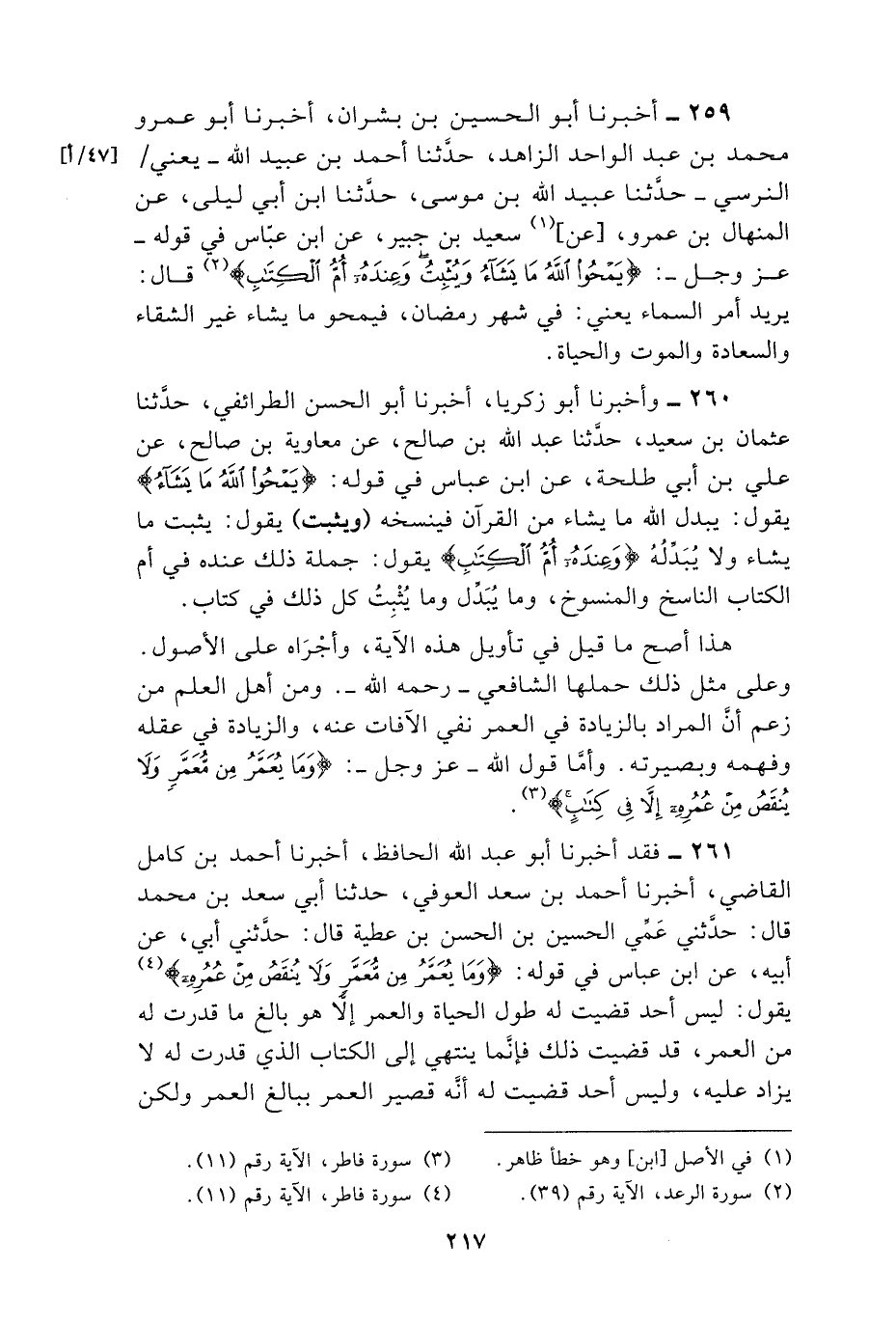 260 - وَأَخْبَرَنَا أَبُو زَكَرِيَّا , أَخْبَرَنَا أَبُو الْحَسَنِ الطَّرَائِفِيُّ , حَدَّثَنَا عُثْمَانُ بْنُ سَعِيدٍ , حَدَّثَنَا عَبْدُ اللَّهِ بْنُ صَالِحٍ , عَنْ مُعَاوِيَةَ بْنِ صَالِحٍ , عَنْ عَلِيِّ بْنِ أَبِي طَلْحَةَ , عَنِ ابْنِ عَبَّاسٍ , فِي قَوْلِهِ: {§يَمْحُو اللَّهُ مَا يَشَاءُ} [الرعد: 39] يَقُولُ: " يُبَدِّلُ اللَّهُ مَا يَشَاءُ مِنَ الْقُرْآنِ فَيَنْسَخُهُ وَيُثْبِتُ يَقُولُ: وَيُثْبِتُ مَا يَشَاءُ وَلَا يُبَدِّلُهُ {وَعِنْدَهُ أُمُّ الْكِتَابِ} [الرعد: 39] يَقُولُ: جُمْلَةُ ذَلِكَ عِنْدَهُ فِي أُمِّ الْكِتَابِ النَّاسِخُ وَالْمَنْسُوخُ , وَمَا يُبَدَّلُ , وَمَا يُثَبَّتُ كُلُّ ذَلِكَ فِي كِتَابٍ " هَذَا أَصَحُّ مَا قِيلَ فِي تَأْوِيلِ هَذِهِ الْآيَةِ , وَأَجْرَاهُ عَلَى الْأُصُولِ. وَعَلَى مِثْلِ ذَلِكَ حَمَلَهَا الشَّافِعِيُّ رَحِمَهُ اللَّهُ. وَمِنْ أَهْلِ الْعِلْمِ مَنْ زَعَمَ أَنَّ الْمُرَادَ بِالزِّيَادَةِ فِي الْعُمُرِ نَفْيُ الْآفَاتِ عَنْهُ , وَالزِّيَادَةُ فِي عَقْلِهِ وَفَهْمِهِ وَبَصِيرَتِهِ. وَأَمَّا قَوْلُ اللَّهِ عَزَّ وَجَلَّ: {وَمَا يُعَمَّرُ مِنْ مُعَمَّرٍ وَلَا يُنْقَصُ مِنْ عُمُرِهِ إِلَّا فِي كِتَابٍ} [فاطر: 11]