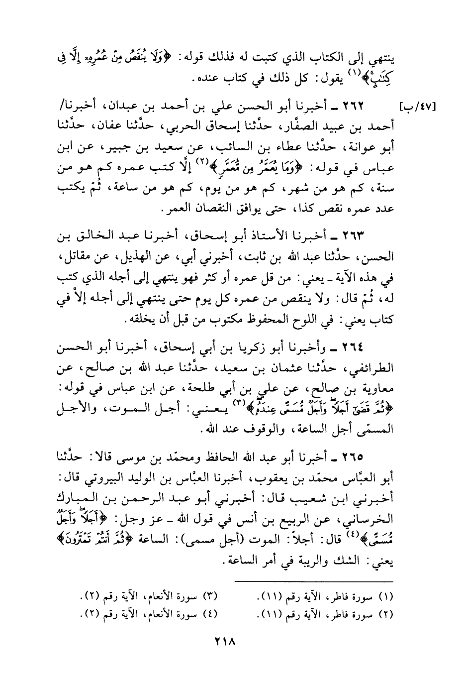 262 - أَخْبَرَنَا أَبُو الْحَسَنِ عَلِيُّ بْنُ أَحْمَدَ بْنِ عَبْدَانَ , أَخْبَرَنَا أَحْمَدُ بْنُ عُبَيْدٍ الصَّفَّارُ , حَدَّثَنَا إِسْحَاقُ الْحَرْبِيُّ , حَدَّثَنَا عَفَّانُ , حَدَّثَنَا أَبُوعَوَانَةَ , حَدَّثَنَا عَطَاءُ بْنُ السَّائِبِ , عَنْ سَعِيدِ بْنِ جُبَيْرٍ , عَنِ ابْنِ عَبَّاسٍ , فِي قَوْلِهِ: {§وَمَا يُعَمَّرُ مِنْ مُعَمَّرٍ} [فاطر: 11] «إِلَّا كُتِبَ عُمْرُهُ كَمْ هُوَ مِنْ سَنَةٍ , كَمْ هُوَ مِنْ شَهْرٍ , كَمْ هُوَ مِنْ يَوْمٍ , كَمْ هُوَ مِنْ سَاعَةٍ , ثُمَّ يُكْتَبُ عَدَدُ عُمْرِهِ نَقَصَ كَذَا , حَتَّى يُوَافِقَ النُّقْصَانُ الْعُمُرَ»