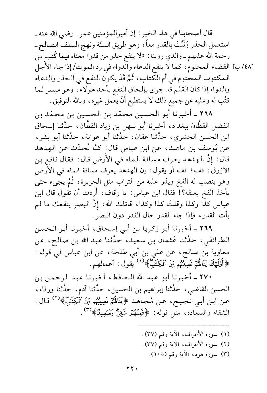 268 - أَخْبَرَنَا أَبُو الْحُسَيْنِ مُحَمَّدُ بْنُ الْحُسَيْنِ بْنِ مُحَمَّدِ بْنِ الْفَضْلِ الْقَطَّانُ بِبَغْدَادَ , أَخْبَرَنَا أَبُو سَهْلِ بْنُ زِيَادٍ الْقَطَّانُ , حَدَّثَنَا إِسْحَاقُ بْنُ الْحَسَنِ الْحَشَرِيُّ , حَدَّثَنَا عَفَّانُ , حَدَّثَنَا أَبُو عَوَانَةَ , حَدَّثَنَا أَبُو بِشْرٍ , عَنْ يُوسُفَ بْنِ مَاهِكٍ , عَنِ ابْنِ عَبَّاسٍ , قَالَ: كُنَّا نُحَدِّثُ عَنِ الْهُدْهُدِ , قَالَ: «إِنَّ §الْهُدْهُدَ يَعْرِفُ مَسَافَةَ الْمَاءِ فِي الْأَرْضِ» قَالَ: فَقَالَ نَافِعُ بْنُ الْأَزْرَقِ: قِفْ , قِفْ أَوَ يَقُولُ: إِنَّ الْهُدْهُدَ يَعْرِفُ مَسَافَةَ الْمَاءِ فِي الْأَرْضِ وَهُوَ يُنْصَبُ لَهُ الْفَخُّ وَيُذَرُّ عَلَيْهِ مِنَ التُّرَابِ مِثْلُ الْحَرِيرَةِ , ثُمَّ يَجِئُ حَتَّى يَأْخُذَ الْفَخَّ بِعُنُقِهِ؟ فَقَالَ ابْنُ عَبَّاسٍ: «يَا وَقَّافُ , أَرَدْتَ أَنْ تَقُولَ قَالَ ابْنُ عَبَّاسٍ كَذَا وَكَذَا وَقُلْتُ كَذَا وَكَذَا قَاتَلَكَ اللَّهُ , إِنَّ الْبَصَرَ يَنْفَعُكَ مَا لَمْ يَأْتِ الْقَدَرُ , فَإِذَا جَاءَ الْقَدَرُ حَالَ الْقَدَرُ دُونَ الْبَصَرِ»