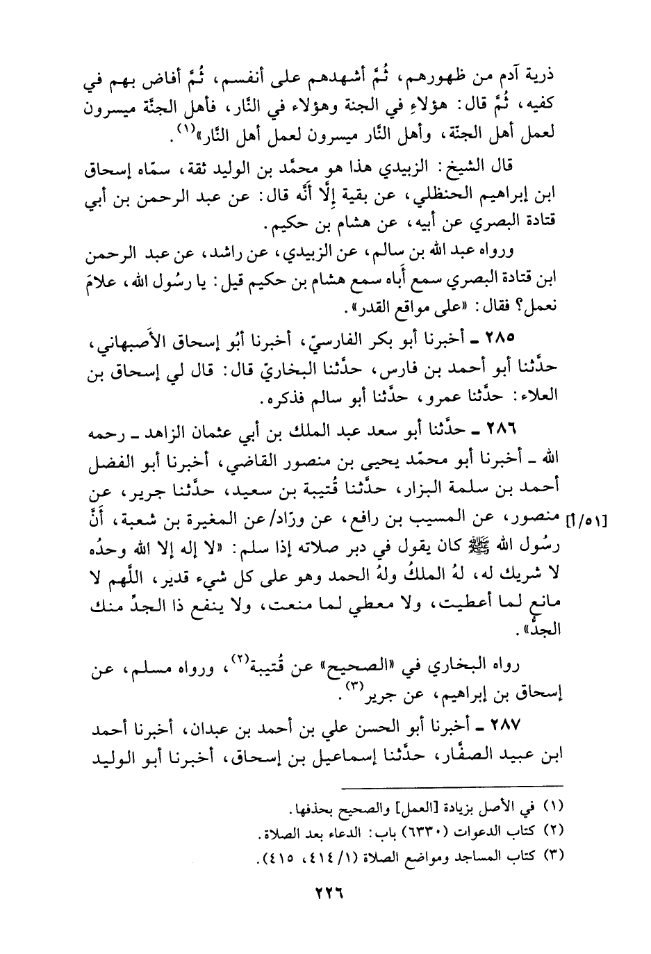 286 - حَدَّثَنَا أَبُو سَعْدٍ عَبْدُ الْمَلِكِ بْنُ أَبِي عُثْمَانَ الزَّاهِدُ , رَحِمَهُ اللَّهُ , أَخْبَرَنَا أَبُو مُحَمَّدٍ يَحْيَى بْنُ مَنْصُورٍ الْقَاضِي , أَخْبَرَنَا أَبُو الْفَضْلِ أَحْمَدُ بْنُ سَلَمَةَ الْبَزَّارُ , حَدَّثَنَا قُتَيْبَةُ بْنُ سَعِيدٍ , حَدَّثَنَا جَرِيرٌ , عَنْ مَنْصُورٍ , عَنِ الْمُسَيِّبِ بْنِ رَافِعٍ , عَنْ وَرَّادٍ , عَنِ الْمُغِيرَةِ بْنِ شُعْبَةَ , أَنَّ رَسُولَ اللَّهِ صَلَّى اللهُ عَلَيْهِ وَسَلَّمَ كَانَ يَقُولُ فِي دُبُرِ صَلَاتِهِ إِذَا سَلَّمَ: §«لَا إِلَهَ إِلَّا اللَّهُ وَحْدَهُ لَا شَرِيكَ لَهُ , لَهُ الْمُلْكُ وَلَهُ الْحَمْدُ وَهُوَ عَلَى كُلِّ شَيْءٍ قَدِيرٌ , اللَّهُمَّ لَا مَانِعَ لِمَا أَعْطَيْتَ , وَلَا مُعْطِي لِمَا مَنَعْتَ , وَلَا يَنْفَعُ ذَا الْجَدِّ مِنْكَ الْجَدُّ» رَوَاهُ الْبُخَارِيُّ فِي الصَّحِيحِ عَنْ قُتَيْبَةَ , وَرَوَاهُ مُسْلِمٌ عَنْ إِسْحَاقَ بْنِ إِبْرَاهِيمَ , عَنْ جَرِيرٍ