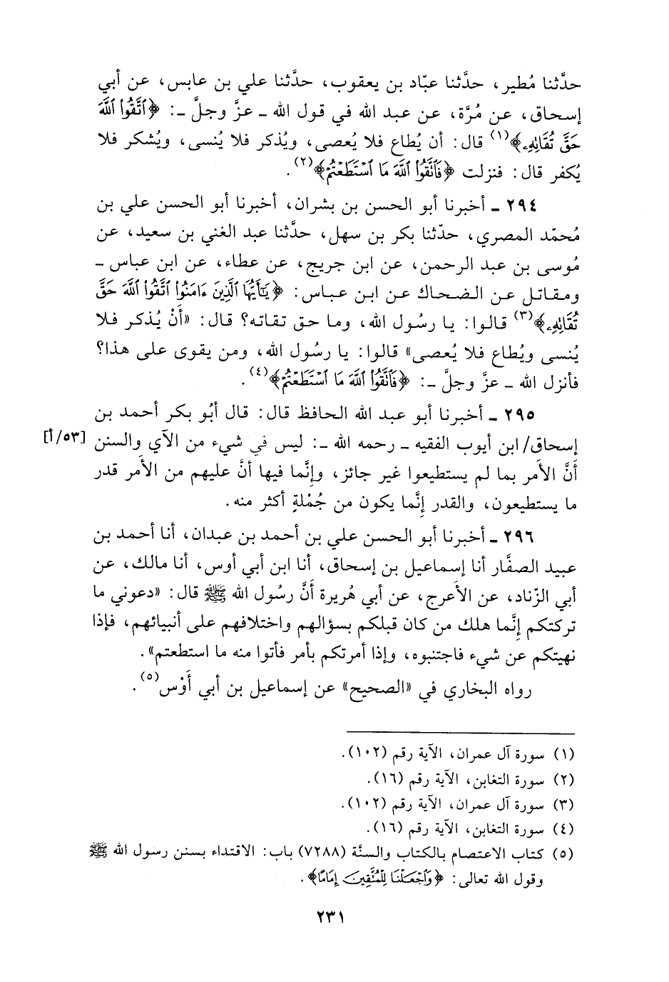 296 - أَخْبَرَنَا أَبُو الْحَسَنِ عَلِيُّ بْنُ أَحْمَدَ بْنِ عَبْدَانَ , أنا أَحْمَدُ بْنُ عُبَيْدٍ الصَّفَّارُ , أنا إِسْمَاعِيلُ بْنُ إِسْحَاقَ , أنا ابْنُ أَبِي أَوْسٍ , أنا مَالِكٌ , عَنْ أَبِي الزِّنَادِ , عَنِ الْأَعْرَجِ , عَنْ أَبِي هُرَيْرَةَ , أَنَّ رَسُولَ اللَّهِ صَلَّى اللهُ عَلَيْهِ وَسَلَّمَ قَالَ: §«دَعُونِي مَا تَرَكْتُكُمْ إِنَّمَا هَلَكَ مَنْ كَانَ قَبْلَكُمْ بِسُؤَالِهِمْ وَاخْتِلَافِهِمْ عَلَى أَنْبِيَائِهِمْ , فَإِذَا نَهَيْتُكُمْ عَنْ شَيْءِ فَاجْتَنِبُوهُ , وَإِذَا أَمَرْتُكُمْ بِأَمْرٍ فَأْتُوا مِنْهُ مَا اسْتَطَعْتُمْ» رَوَاهُ الْبُخَارِيُّ فِي الصَّحِيحِ عَنْ إِسْمَاعِيلَ بْنِ أَبِي أَوْسٍ -[232]- وَرَوَاهُ مُسْلِمٌ مِنْ وَجْهٍ آخَرَ عَنْ أَبِي الزِّنَادِ وَفِيهِ إِخْبَارٌ عَنْ أَمْرِهِ إِيَّاهُمْ بِمَا لَا يَسْتَطِيعُونَ فِعْلَهُ , وَأَنَّ عَلَيْهِمْ مِنْ جُمْلَةِ مَا يَأْمُرُهُمْ بِهِ مَا يَسْتَطِيعُونَ فِعْلَهُ , وَالْخَبَرُ وَارِدٌ فِي الْمُسْلِمِينَ