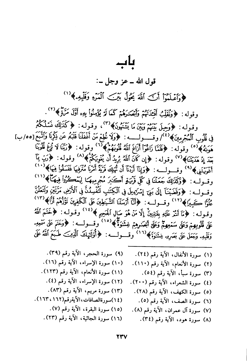 §بَابُ قَوْلِ اللَّهِ عَزَّ وَجَلَّ: {وَاعْلَمُوا أَنَّ اللَّهَ يَحُولُ بَيْنَ الْمَرْءِ وَقَلْبِهِ} [الأنفال: 24] وَقَوْلُهُ: {وَنُقَلِّبُ أَفْئِدَتَهُمْ وَأَبْصَارَهُمْ كَمَا لَمْ يُؤْمِنُوا بِهِ أَوَّلَ مَرَّةٍ} [الأنعام: 110] وَقَوْلُهُ: {وَحِيلَ بَيْنَهُمْ وَبَيْنَ مَا يَشْتَهُونَ} [سبأ: 54] , وَقَوْلُهُ: {كَذَلِكَ نَسْلُكُهُ فِي قُلُوبِ الْمُجْرِمِينَ} [الحجر: 12] وَقَوْلُهُ: {وَلَا تُطِعْ مَنْ أَغْفَلْنَا قَلْبَهُ عَنْ ذِكْرِنَا وَاتَّبَعَ هَوَاهُ} [الكهف: 28] وَقَوْلُهُ: {فَلَمَّا زَاغُوا أَزَاغَ اللَّهُ قُلُوبَهُمْ} [الصف: 5] وَقَوْلُهُ: {رَبَّنَا لَا تُزِغْ قُلُوبَنَا بَعْدَ إِذْ هَدَيْتَنَا} [آل عمران: 8] وَقَوْلُهُ: {إِنْ كَانَ اللَّهُ يُرِيدُ أَنْ يُغْوِيَكُمْ} [هود: 34] وَقَوْلُهُ: {رَبِّ بِمَا أَغْوَيْتَنِي} [الحجر: 39] وَقَوْلُهُ: {وَإِذَا أَرَدْنَا أَنْ نُهْلِكَ قَرْيَةً أَمَرْنَا مُتْرَفِيهَا فَفَسَقُوا فِيهَا} [الإسراء: 16] وَقَوْلُهُ: {وَكَذَلِكَ جَعَلْنَا فِي كُلِّ قَرْيَةٍ أَكَابِرَ مُجْرِمِيهَا لِيَمْكُرُوا فِيهَا} [الأنعام: 123] وَقَوْلُهُ: {وَقَضَيْنَا إِلَى بَنِي إِسْرَائِيلَ فِي الْكِتَابِ لَتُفْسِدُنَّ فِي الْأَرْضِ مَرَّتَيْنِ وَلَتَعْلُنَّ عُلُوًّا كَبِيرًا} [الإسراء: 4] وَقَوْلُهُ: {أَنَّا أَرْسَلْنَا الشَّيَاطِينَ عَلَى الْكَافِرِينَ تَؤُزُّهُمْ أَزًّا} [مريم: 83] وَقَوْلُهُ: {مَا أَنْتُمْ عَلَيْهِ بِفَاتِنِينَ إِلَّا مَنْ هُوَ صَالِ الْجَحِيمِ} [الصافات: 163] وَقَوْلُهُ: {خَتَمَ اللَّهُ عَلَى قُلُوبِهِمْ وَعَلَى سَمْعِهِمْ وَعَلَى أَبْصَارِهِمْ غِشَاوَةٌ} [البقرة: 7] وَقَوْلُهُ: {وَخَتَمَ عَلَى سَمْعِهِ وَقَلْبِهِ وَجَعَلَ عَلَى بَصَرِهِ غِشَاوَةً} [الجاثية: 23] وَقَوْلُهُ: {أُولَئِكَ الَّذِينَ طَبَعَ اللَّهُ عَلَى