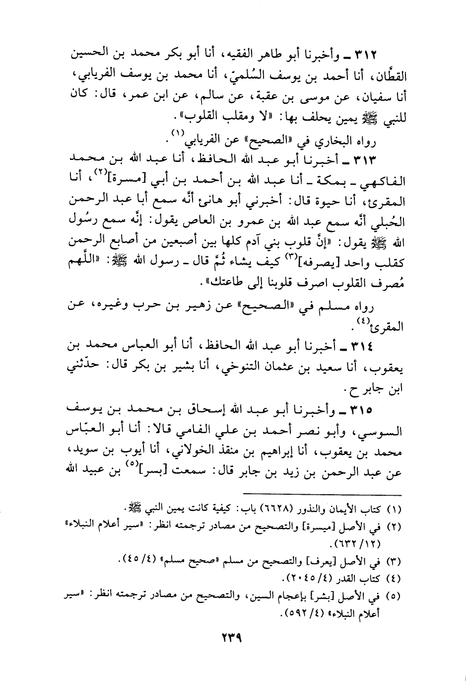 312 - وَأَخْبَرَنَا أَبُو طَاهِرٍ الْفَقِيهُ , أنا أَبُو بَكْرٍ مُحَمَّدُ بْنُ الْحُسَيْنِ الْقَطَّانُ , أنا أَحْمَدُ بْنُ يُوسُفَ السُّلَمِيُّ , أنا مُحَمَّدُ بْنُ يُوسُفَ الْفِرْيَابِيُّ , أنا سُفْيَانُ , عَنْ مُوسَى بْنِ عُقْبَةَ , عَنْ سَالِمٍ , عَنِ ابْنِ عُمَرَ , قَالَ: كَانَ لِلنَّبِيِّ صَلَّى اللهُ عَلَيْهِ وَسَلَّمَ يَمِينٌ يَحْلِفُ بِهَا: §«لَا وَمُقَلِّبِ الْقُلُوبِ» رَوَاهُ الْبُخَارِيُّ فِي الصَّحِيحِ عَنِ الْفِرْيَابِيِّ