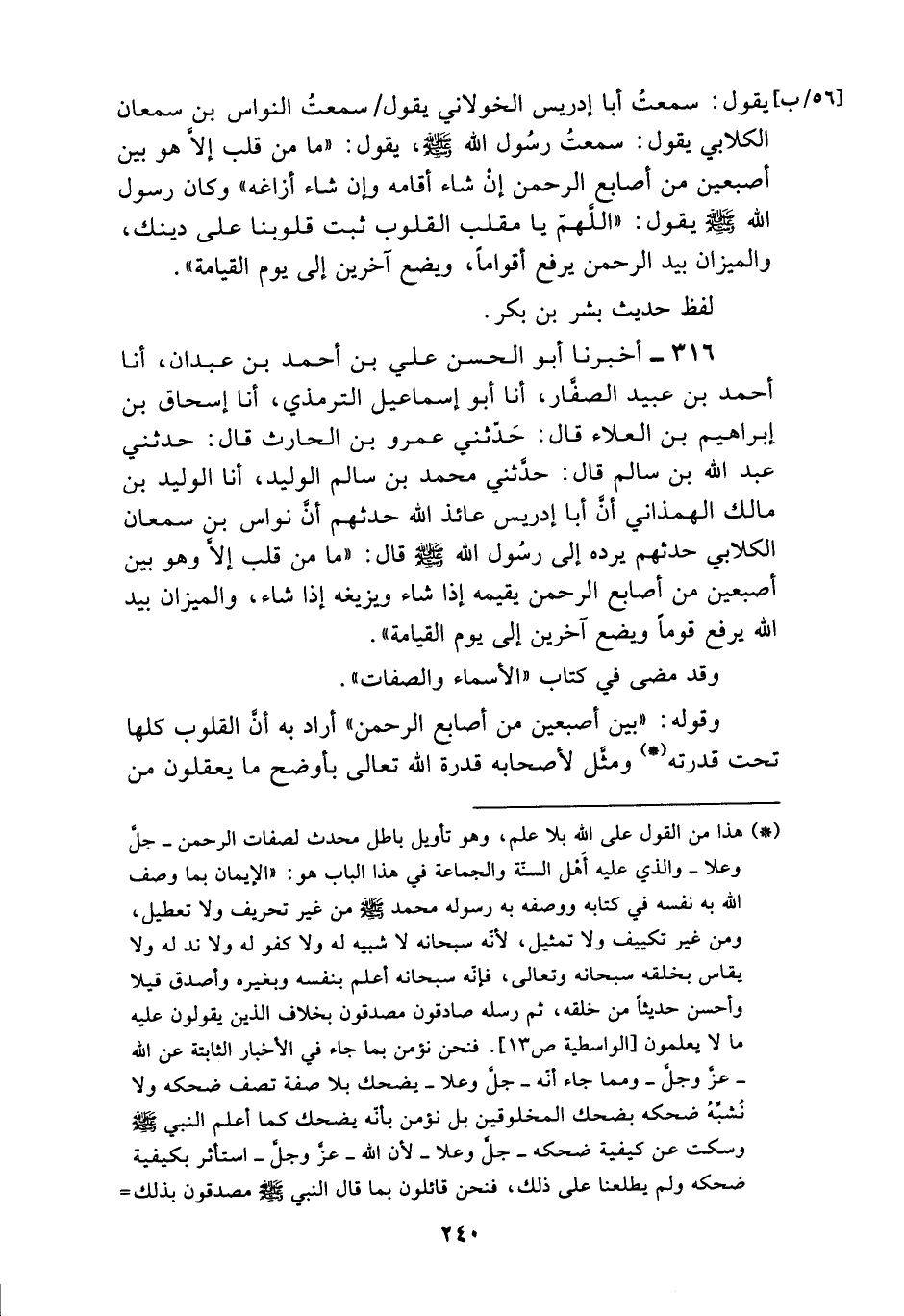 316 - أَخْبَرَنَا أَبُو الْحَسَنِ عَلِيُّ بْنُ أَحْمَدَ بْنِ عَبْدَانَ , أنا أَحْمَدُ بْنُ عُبَيْدٍ الصَّفَّارُ , أنا أَبُو إِسْمَاعِيلَ التِّرْمِذِيُّ , أنا إِسْحَاقُ بْنُ إِبْرَاهِيمَ بْنِ الْعَلَاءِ , قَالَ: حَدَّثَنِي عَمْرُو بْنُ الْحَارِثِ , قَالَ: حَدَّثَنِي عَبْدُ اللَّهِ بْنُ سَالِمٍ , قَالَ: حَدَّثَنِي مُحَمَّدُ بْنُ سَالِمٍ الْوَلِيدُ , أنا الْوَلِيدُ بْنُ مَالِكٍ الْهَمَذَانِيُّ , أَنَّ أَبَا إِدْرِيسَ عَائِذُ اللَّهِ حَدَّثَهُمْ , أَنَّ نُوَاسَ بْنَ سَمْعَانَ الْكِلَابِيَّ حَدَّثَهُمْ يَرُدُّهُ , إِلَى رَسُولِ اللَّهِ صَلَّى اللهُ عَلَيْهِ وَسَلَّمَ قَالَ: §«مَا مِنْ قَلْبٍ إِلَّا وَهُوَ بَيْنَ أُصْبُعَيْنِ مِنْ أَصَابِعِ الرَّحْمَنِ يُقِيمُهُ إِذَا شَاءَ , وَيُزِيغُهُ إِذَا شَاءَ , وَالْمِيزَانُ بِيَدِ اللَّهِ يَرْفَعُ قَوْمًا وَيَضَعُ آخَرِينَ إِلَى يَوْمِ الْقِيَامَةِ» وَقَدْ مَضَى فِي كِتَابِ الْأَسْمَاءِ وَالصِّفَاتِ , وَقَوْلُهُ: «بَيْنَ أُصْبُعَيْنِ مِنْ أَصَابِعِ الرَّحْمَنِ» أَرَادَ بِهِ أَنَّ الْقُلُوبَ كُلَّهَا تَحْتَ قُدْرَتِهِ , وَمَثَّلَ لِأَصْحَابِهِ قُدْرَةَ اللَّهِ تَعَالَى بِأَوْضِحِ مَا يَعْقِلُونَ مِنْ -[241]- أَنْفُسِهِمْ , لِأَنَّ الْمَرْءَ لَا يَكُونُ أَقْدَرَ عَلَى شَيْءٍ مِنْهُ عَلَى مَا بَيْنَ أُصْبُعَيْهِ , وَيُحْتَمَلُ أَنَّهُ أَرَادَ أَنَّهَا بَيْنَ نِعْمَتَيِ النَّفْعِ وَالدَّفْعِ , أَوْ بَيْنَ أَثَرَيْهِ فِي الْفَضْلِ وَالْعَدْلِ يُؤَيِّدُهُ قَوْلُهُ: «إِنْ شَاءَ أَقَامَهُ وَإِنْ شَاءَ أَزَاغَهُ» وَرُوِيَ ذَلِكَ أَيْضًا فِي حَدِيثِ أُمِّ سَلَمَةَ عَنِ النَّبِيِّ صَلَّى اللهُ عَلَيْهِ وَسَلَّمَ