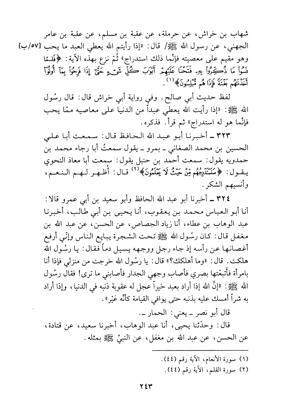 323 - أَخْبَرَنَا أَبُو عَبْدِ اللَّهِ الْحَافِظُ , قَالَ: سَمِعْتُ أَبَا عَلِيٍّ الْحُسَيْنُ بْنُ مُحَمَّدٍ الصَّغَانِيَّ , بِمَرْوَ يَقُولُ: سَمِعْتُ أَبَا رَجَاءٍ مُحَمَّدُ بْنُ حَمْدَوَيْهِ يَقُولُ: سَمِعْتُ أَحْمَدَ بْنَ حَنْبَلٍ , يَقُولُ: سَمِعْتُ أَبَا مُعَاذٍ النَّحْوِيَّ , يَقُولُ: {§سَنَسْتَدْرِجُهُمْ مِنْ حَيْثُ لَا يَعْلَمُونَ} [الأعراف: 182] قَالَ: «أُظْهِرُ لَهُمُ النِّعَمَ , وَأُنْسِيهِمُ الشُّكْرَ»