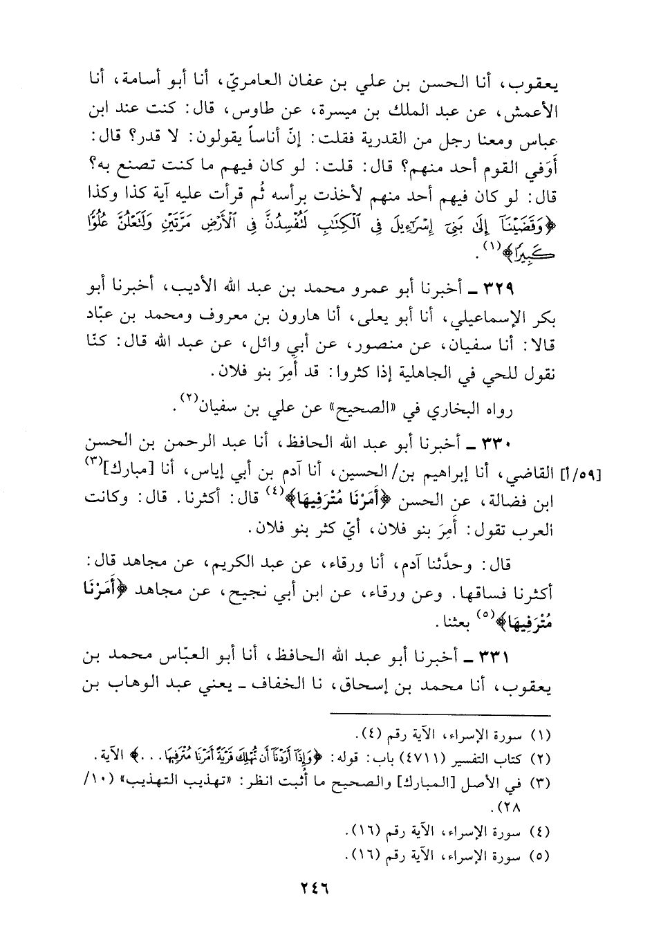 331 - أَخْبَرَنَا أَبُو عَبْدِ اللَّهِ الْحَافِظُ , أنا أَبُو الْعَبَّاسِ مُحَمَّدُ بْنُ يَعْقُوبَ , أنا مُحَمَّدُ بْنُ إِسْحَاقَ , نا الْخَفَّافُ يَعْنِي عَبْدَ الْوَهَّابِ بْنِ -[247]- عَطَاءٍ , أنا سَعِيدٌ , عَنْ قَتَادَةَ , وَالْحَسَنِ , {§أَمَرْنَا مُتْرَفِيهَا} [الإسراء: 16] يَقُولُ: «أَكْثَرْنَا جَبَابِرَتَهَا» وَعَنْ هَارُونَ عَنْ أَبِي الْمُعَلَّى , عَنْ يَحْيَى بْنِ يَعْمَرَ أَنَّهُ كَانَ يَقُولُ: {أَمَرْنَا مُتْرَفِيهَا} [الإسراء: 16] وَتَفْسِيرُهُ مِثْلَ قَوْلِ الْحَسَنِ وَقَتَادَةَ