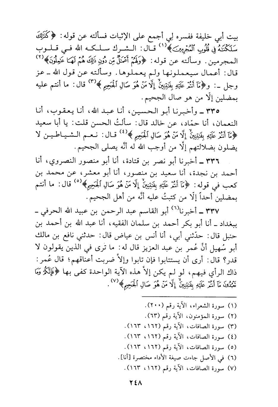 336 - أَخْبَرَنَا أَبُو نَصْرِ بْنُ قَتَادَةَ , أنا أَبُو مَنْصُورٍ النَّصْرَوِيُّ , أنا أَحْمَدُ بْنُ نَجْدَةَ , أنا سَعِيدُ بْنُ مَنْصُورٍ , أنا أَبُو مَعْشَرٍ , عَنْ مُحَمَّدِ بْنِ كَعْبٍ فِي قَوْلِهِ: {§مَا أَنْتُمْ عَلَيْهِ بِفَاتِنِينَ إِلَّا مَنْ هُوَ صَالِ الْجَحِيمِ} [الصافات: 163] قَالَ: «مَا أَنْتُمْ بِمُضِلِّينَ أَحَدًا إِلَّا مَنْ كَتَبْتُ عَلَيْهِ أَنَّهُ مِنْ أَهْلِ الْجَحِيمِ»