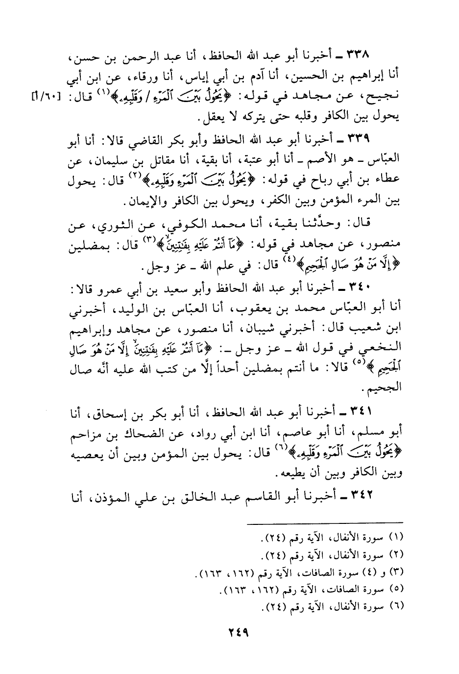 338 - أَخْبَرَنَا أَبُو عَبْدِ اللَّهِ الْحَافِظُ , أنا عَبْدُ الرَّحْمَنِ بْنُ حَسَنٍ , أنا إِبْرَاهِيمُ بْنُ الْحُسَيْنِ , أنا آدَمُ بْنُ أَبِي إِيَاسٍ , أنا وَرْقَاءُ , عَنِ ابْنِ أَبِي نَجِيحٍ , عَنْ مُجَاهِدٍ , فِي قَوْلِهِ: {§يَحُولُ بَيْنَ الْمَرْءِ وَقَلْبِهِ} [الأنفال: 24] قَالَ: «يَحُولُ بَيْنَ الْكَافِرِ وَقَلْبِهِ حَتَّى يَتْرُكَهُ لَا يَعْقِلُ»