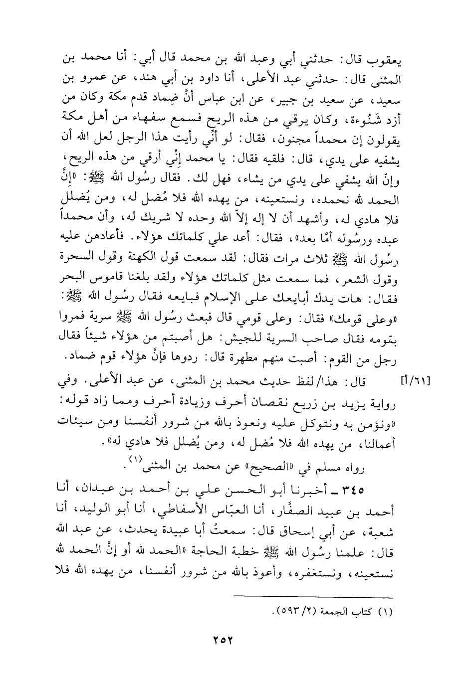 345 - أَخْبَرَنَا أَبُو الْحَسَنِ عَلِيُّ بْنُ أَحْمَدَ بْنِ عَبْدَانَ , أنا أَحْمَدُ بْنُ عُبَيْدٍ الصَّفَّارُ , أنا الْعَبَّاسُ الْأَسْفَاطِيُّ , أنا أَبُو الْوَلِيدِ , أنا شُعْبَةُ , عَنْ أَبِي إِسْحَاقَ , قَالَ: سَمِعْتُ أَبَا عُبَيْدَةَ يُحَدِّثُ , عَنْ عَبْدِ اللَّهِ , قَالَ: عَلَّمَنَا رَسُولُ اللَّهِ صَلَّى اللهُ عَلَيْهِ وَسَلَّمَ خُطْبَةَ الْحَاجَةِ: §«الْحَمْدُ لِلَّهِ - أَوْ - إِنَّ الْحَمْدَ لِلَّهِ نَسْتَعِينُهُ , وَنَسْتَغْفِرُهُ , وَأَعُوذُ بِاللَّهِ مِنْ شُرُورِ أَنْفُسِنَا , مَنْ يَهْدِهِ اللَّهُ فَلَا -[253]- مُضِلَّ لَهُ , وَمَنْ يُضْلِلْ فَلَا هَادِيَ لَهُ , وَأَشْهَدُ أَنْ لَا إِلَهَ إِلَّا اللَّهُ , وَأَشْهَدُ أَنَّ مُحَمَّدًا عَبْدُهُ وَرَسُولُهُ» , ثُمَّ يَقْرَأُ ثَلَاثَ آيَاتٍ: {يَا أَيُّهَا الَّذِينَ آمَنُوا اتَّقُوا اللَّهَ وَقُولُوا قَوْلًا سَدِيدًا} [الأحزاب: 70] الْآيَةَ , {اتَّقُوا اللَّهَ حَقَّ تُقَاتِهِ وَلَا تَمُوتُنَّ إِلَّا وَأَنْتُمْ مُسْلِمُونَ} [آل عمران: 102] , {يَا أَيُّهَا النَّاسُ اتَّقُوا رَبَّكُمُ الَّذِي خَلَقَكُمْ مِنْ نَفْسٍ وَاحِدَةٍ} [النساء: 1] الْآيَةَ , ثُمَّ يَتَكَلَّمُ بِحَاجَتِهِ وَرُوِّينَاهُ عَنْ أَبِي إِسْحَاقَ , عَنْ أَبِي الْأَحْوَصِ , وَأَبِي عُبَيْدَةَ , عَنْ عَبْدِ اللَّهِ , وَعَنْ أَبِي عِيَاضٍ , عَنْ عَبْدِ اللَّهِ
