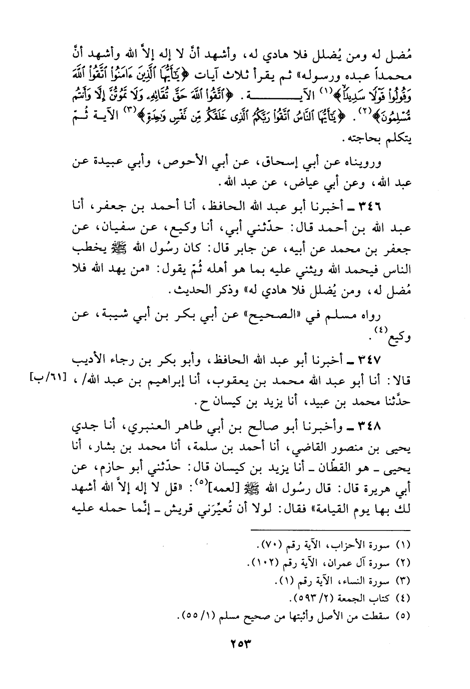 346 - أَخْبَرَنَا أَبُو عَبْدِ اللَّهِ الْحَافِظُ , أنا أَحْمَدُ بْنُ جَعْفَرٍ , أنا عَبْدُ اللَّهِ بْنُ أَحْمَدَ , قَالَ: حَدَّثَنِي أَبِي , أنا وَكِيعٌ , عَنْ سُفْيَانَ , عَنْ جَعْفَرِ بْنِ مُحَمَّدٍ , عَنْ أَبِيهِ , عَنْ جَابِرٍ , قَالَ: كَانَ رَسُولُ اللَّهِ صَلَّى اللهُ عَلَيْهِ وَسَلَّمَ يَخْطُبُ النَّاسَ فَيَحْمَدُ اللَّهَ وَيُثْنِي عَلَيْهِ بِمَا هُوَ أَهْلُهُ ثُمَّ يَقُولُ: §«مَنْ يَهْدِ اللَّهُ فَلَا مُضِلَّ لَهُ , وَمَنْ يُضْلِلْ فَلَا هَادِيَ لَهُ» وَذَكَرَ الْحَدِيثَ رَوَاهُ مُسْلِمٌ فِي الصَّحِيحِ عَنْ أَبِي بَكْرِ بْنِ أَبِي شَيْبَةَ , عَنْ وَكِيعٍ