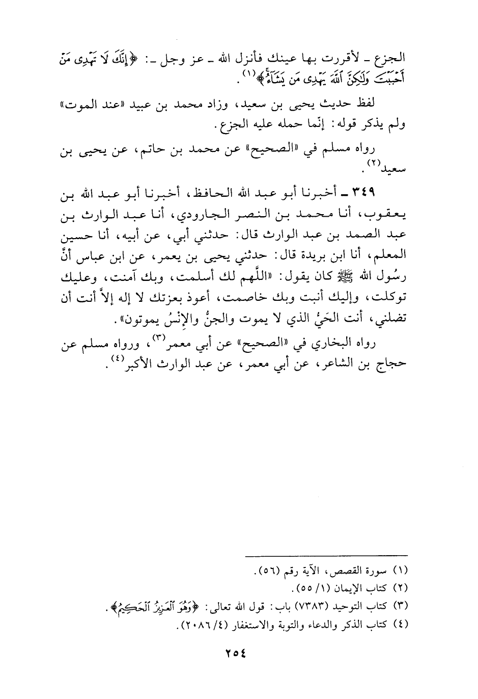 349 - أَخْبَرَنَا أَبُو عَبْدِ اللَّهِ الْحَافِظُ , أَخْبَرَنَا أَبُو عَبْدِ اللَّهِ بْنُ يَعْقُوبَ , أنا مُحَمَّدُ بْنُ النَّصْرِ الْجَارُودِيُّ , أنا عَبْدُ الْوَارِثِ بْنُ عَبْدِ الصَّمَدِ بْنِ عَبْدِ الْوَارِثِ , قَالَ: حَدَّثَنِي أَبِي عَنْ أَبِيهِ أنا حُسَيْنُ الْمُعَلِّمُ أنا ابْنُ بُرَيْدَةَ , قَالَ: حَدَّثَنِي يَحْيَى بْنِ يَعْمُرَ عَنِ ابْنِ عَبَّاسٍ , أَنَّ رَسُولَ اللَّهِ صَلَّى اللهُ عَلَيْهِ وَسَلَّمَ كَانَ يَقُولُ: «اللَّهُمَّ §لَكَ أَسْلَمْتُ , وَبِكَ أَمَنْتُ , وَعَلَيْكَ تَوَكَّلْتُ , وَإِلَيْكَ أَنَبْتُ وَبِكَ خَاصَمْتُ , أَعُوذُ بِعِزَّتِكَ لَا إِلَهَ إِلَّا أَنْتَ أَنْ تُضِلَّنِي , أَنْتَ الْحَيُّ الَّذِي لَا يَمُوتُ وَالْجِنُّ وَالْإِنْسُ يَمُوتُونَ» رَوَاهُ الْبُخَارِيُّ فِي الصَّحِيحِ عَنْ أَبِي مَعْمَرٍ , وَرَوَاهُ مُسْلِمٌ عَنْ حَجَّاجِ بْنِ الشَّاعِرِ , عَنْ أَبِي مَعْمَرٍ , عَنْ عَبْدِ الْوَارِثِ الْأَكْبَرِ