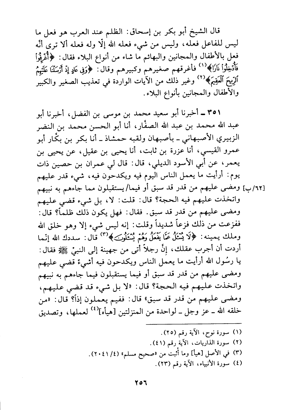 351 - أَخْبَرَنَا أَبُو سَعِيدٍ مُحَمَّدُ بْنُ مُوسَى بْنِ الْفَضْلِ , أَخْبَرَنَا أَبُو عَبْدِ اللَّهِ مُحَمَّدُ بْنُ عَبْدِ اللَّهِ الصَّفَّارُ , أنا أَبُو الْحَسَنِ مُحَمَّدُ بْنُ النَّضْرِ الزُّبَيْرِيُّ الْأَصْبَهَانِيُّ بِأَصْبَهَانَ وَلَقَبُهُ حَمْشَاذٌ , أنا بَكْرُ بْنُ بَكَّارٍ أَبُو عَمْرٍو الْقَيْسِيُّ , أنا عَزْرَةُ بْنُ ثَابِتٍ , أنا يَحْيَى بْنُ عَقِيلٍ , عَنْ يَحْيَى بْنِ يَعْمَرَ , عَنْ أَبِي الْأَسْوَدِ الدِّيلِيِّ , قَالَ: قَالَ لِي عِمْرَانُ بْنُ حُصَيْنٍ ذَاتَ يَوْمٍ: أَرَأَيْتَ مَا يَعْمَلُ النَّاسُ الْيَوْمَ فِيهِ وَيَكْدَحُونَ فِيهِ شَيْءٌ قُدِّرَ عَلَيْهِمْ وَمَضَى عَلَيْهِمْ مِنْ قَدَرِ قَدْ سَبَقَ أَوْ فِيمَا يَسْتَقْبِلُونَ مِمَّا جَاءَهُمْ بِهِ نَبِيُّهُمْ وَاتُّخِذَتْ عَلَيْهِمْ فِيهِ الْحُجَّةُ؟ قَالَ: قُلْتُ: لَا , بَلْ شَيْءٌ قُضِيَ عَلَيْهِمْ وَمَضَى عَلَيْهِمْ مِنْ قَدَرٍ قَدْ سَبَقَ. فَقَالَ: فَهَلْ يَكُونُ ذَلِكَ ظُلْمًا؟ قَالَ: فَفَزِعْتُ مِنْ ذَلِكَ فَزَعًا شَدِيدًا وَقُلْتُ: إِنَّهُ لَيْسَ شَيْءٌ إِلَّا وَهُوَ خَلْقُ اللَّهِ وَمِلْكُ يَمِينِهِ: {لَا يُسْأَلُ عَمَّا يَفْعَلُ وَهُمْ يُسْأَلُونَ} [الأنبياء: 23] قَالَ: سَدَّدَكَ اللَّهُ إِنَّمَا أَرَدْتُ أَنْ أُجَرِّبَ عَقْلَكَ , إِنَّ رَجُلًا أَتَى مِنْ جُهَيْنَةَ إِلَى النَّبِيِّ صَلَّى اللَّهُ عُلَيْهِ وَسَلَّمَ فَقَالَ: يَا رَسُولَ اللَّهِ أَرَأَيْتَ مَا يَعْمَلُ النَّاسُ وَيَكْدَحُونَ فِيهِ أشَيْءٌ قُضِيَ عَلَيْهِمْ وَمَضَى عَلَيْهِمْ مِنْ قَدَرٍ قَدْ سَبَقَ أَوْ فِيمَا يَسْتَقْبِلُونَ فِيمَا جَاءَهُمْ بِهِ نَبِيُّهُمْ وَاتُّخِذَتْ عَلَيْهِمْ فِيهِ الْحُجَّةُ؟ قَالَ: «لَا §بَلْ شَيْءٌ قَدْ قُضِيَ عَلَيْهِمْ , وَمَضَى عَلَيْهِمْ مِنْ قَدَرٍ قَدْ سَبَقَ» قَالَ: فَفِيمَ يَعْمَلُونَ إِذًا؟ قَالَ: " مَنْ خَلَقَهُ اللَّهُ عَزَّ وَجَلَّ لِوَاحِدَةٍ مِنَ الْمَنْزِلَتَيْنِ هَيَّأَهُ لِعَمَلِهَا , وَتَصْدِيقُ -[257]- ذَلِكَ فِي كِتَابِ اللَّهِ عَزَّ وَجَلَّ {وَنَفْسٍ وَمَا سَوَّاهَا فَأَلْهَمَهَا فُجُورَهَا وَتَقْوَاهَا} [الشمس: 8] " أَخْرَجَهُ مُسْلِمٌ فِي الصَّحِيحِ مِنْ حَدِيثِ عَزْرَةَ كَمَا مَضَى