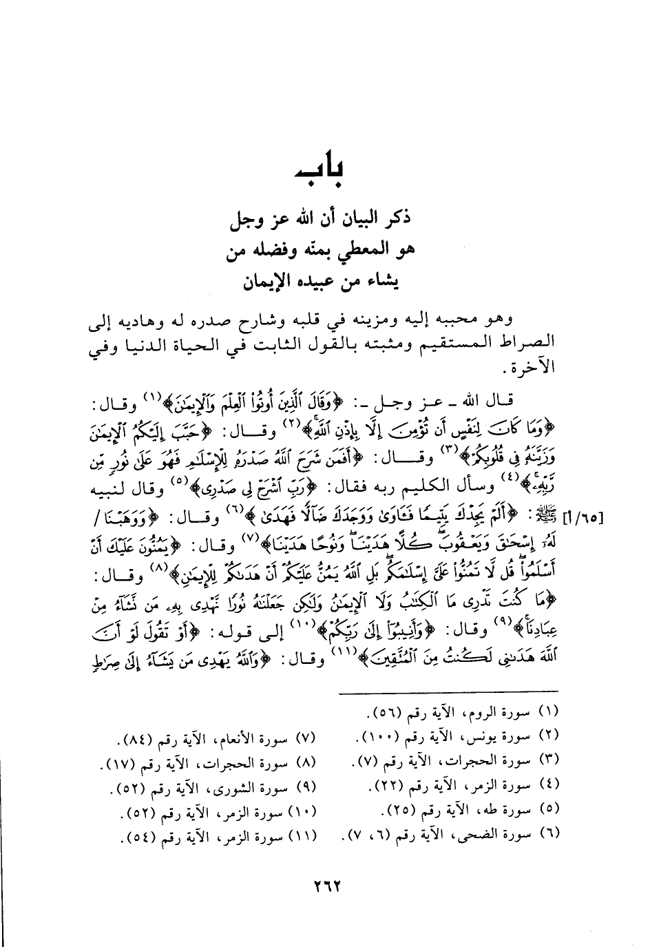 §بَابُ ذِكْرِ الْبَيَانِ أَنَّ اللَّهَ عَزَّ وَجَلَّ هُوَ الْمُعْطِي بِمَنِّهِ وَفَضْلِهِ مَنْ يَشَاءُ مِنْ عَبِيدِهِ الْإِيمَانَ وَهُوَ مُحَبِّبُهُ إِلَيْهِ وَمُزَيِّنُهُ فِي قَلْبِهِ وَشَارِحُ صَدْرِهِ لَهُ وَهَادِيهِ إِلَى الصِّرَاطِ الْمُسْتَقِيمِ وَمُثَبِّتُهُ بِالْقَوْلِ الثَّابِتِ فِي الْحَيَاةِ الدُّنْيَا وَفِي الْآخِرَةِ. قَالَ اللَّهُ عَزَّ وَجَلَّ: {وَقَالَ الَّذِينَ أُوتُوا الْعِلْمَ وَالْإِيمَانَ} [الروم: 56] وَقَالَ: {وَمَا كَانَ لِنَفْسٍ أَنْ تُؤْمِنَ إِلَّا بِإِذْنِ اللَّهِ} [يونس: 100] وَقَالَ: {حَبَّبَ إِلَيْكُمُ الْإِيمَانَ وَزَيَّنَهُ فِي قُلُوبِكُمْ} [الحجرات: 7] وَقَالَ: {أَفَمَنْ شَرَحَ اللَّهُ صَدْرَهُ لِلْإِسْلَامِ فَهُوَ عَلَى نُورٍ مِنْ رَبِّهِ} [الزمر: 22] وَسَأَلَ الْكَلِيمُ رَبَّهُ فَقَالَ: {رَبِّ اشْرَحْ لِي صَدْرِي} [طه: 25] وَقَالَ لِنَبِيِّهِ صَلَّى اللهُ عَلَيْهِ وَسَلَّمَ: {أَلَمْ يَجِدْكَ يَتِيمًا فَآوَى وَوَجَدَكَ ضَالًّا فَهَدَى} [الضحى: 7] وَقَالَ: {وَوَهَبْنَا لَهُ إِسْحَاقَ وَيَعْقُوبَ كُلًّا هَدَيْنَا وَنُوحًا هَدَيْنَا} وَقَالَ: {يَمُنُّونَ عَلَيْكَ أَنْ أَسْلَمُوا قُلْ لَا تَمُنُّوا عَلَيَّ إِسْلَامَكُمْ بَلِ اللَّهُ يَمُنُّ عَلَيْكُمْ أَنْ هَدَاكُمْ لِلْإِيمَانِ} [الحجرات: 17] وَقَالَ: {مَا كُنْتَ تَدْرِي مَا الْكِتَابُ وَلَا الْإِيمَانُ وَلَكِنْ جَعَلْنَاهُ نُورًا نَهْدِي بِهِ مَنْ نَشَاءُ مِنْ عِبَادِنَا} [الشورى: 52] وَقَالَ: {وَأَنِيبُوا إِلَى رَبِّكُمْ} [الزمر: 54] إِلَى قَوْلِهِ: {أَوْ تَقُولَ لَوْ أَنَّ اللَّهَ هَدَانِي لَكُنْتُ مِنَ الْمُتَّقِينَ} [الزمر: 57] وَقَالَ: {وَاللَّهُ يَهْدِي مَنْ يَشَاءُ إِلَى صِرَاطٍ