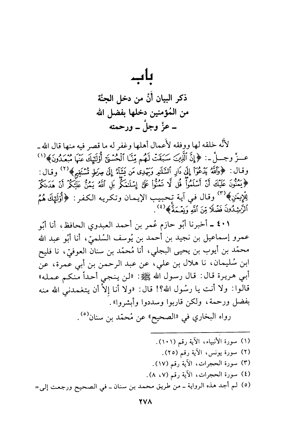 §بَابُ ذِكْرِ الْبَيَانِ أَنَّ مَنْ دَخَلَ الْجَنَّةَ مِنَ الْمُؤْمِنِينَ دَخَلَهَا بِفَضْلِ اللَّهِ عَزَّ وَجَلَّ وَرَحْمَتِهِ لِأَنَّهُ خَلَقَهُ لَهَا وَوَفَّقَهُ لِأَعْمَالِ أَهْلِهَا وَغَفَرَ لَهُ مَا قَصَّرَ فِيهِ مِنْهَا قَالَ اللَّهُ عَزَّ وَجَلَّ: {إِنَّ الَّذِينَ سَبَقَتْ لَهُمْ مِنَّا الْحُسْنَى أُولَئِكَ عَنْهَا مُبْعَدُونَ} [الأنبياء: 101] وَقَالَ: {وَاللَّهُ يَدْعُو إِلَى دَارِ السَّلَامِ وَيَهْدِي مَنْ يَشَاءُ إِلَى صِرَاطٍ مُسْتَقِيمٍ} [يونس: 25] وَقَالَ: {يَمُنُّونَ عَلَيْكَ أَنْ أَسْلَمُوا قُلْ لَا تَمُنُّوا عَلَيَّ إِسْلَامَكُمْ بَلِ اللَّهُ يَمُنُّ عَلَيْكُمْ أَنْ هَدَاكُمْ لِلْإِيمَانِ} [الحجرات: 17] وَقَالَ فِي آيَةِ تَحْبِيبِ الْإِيمَانِ وَتَكْرِيهِ الْكُفْرِ: {أُولَئِكَ هُمُ الرَّاشِدُونَ فَضْلًا مِنَ اللَّهِ وَنِعْمَةً} [الحجرات: 8]