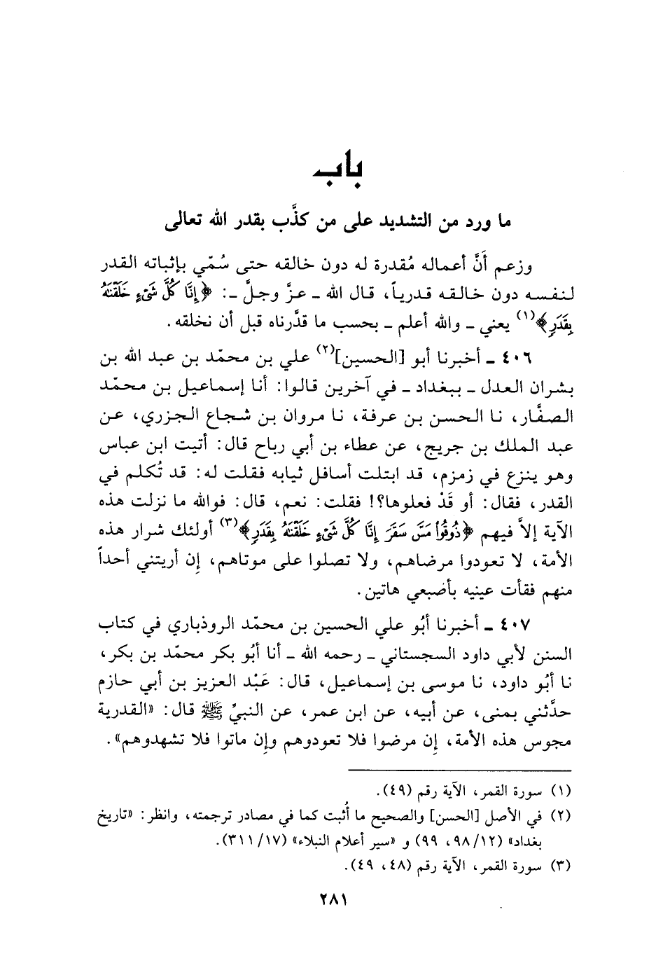 407 - أَخْبَرَنَا أَبُو عَلِيٍّ الْحُسَيْنُ بْنُ مُحَمَّدٍ الرُّوذْبَارِيُّ , فِي كِتَابِ السُّنَنِ لِأَبِي دَاوُدَ السِّجِسْتَانِيِّ رَحِمَهُ اللَّهُ , أنا أَبُو بَكْرٍ مُحَمَّدُ بْنُ بَكْرٍ , نا أَبُو دَاوُدَ , نا مُوسَى بْنُ إِسْمَاعِيلَ قَالَ: عَبْدُ الْعَزِيزِ بْنُ أَبِي حَازِمٍ حَدَّثَنِي بِمِنًى , عَنْ أَبِيهِ , عَنِ ابْنِ عُمَرَ , عَنِ النَّبِيِّ صَلَّى اللهُ عَلَيْهِ وَسَلَّمَ قَالَ: §«الْقَدَرِيَّةُ مَجُوسُ هَذِهِ الْأُمَّةِ , إِنْ مَرِضُوا فَلَا تَعُودُوهُمْ وَإِنْ مَاتُوا فَلَا تَشْهَدُوهُمْ»