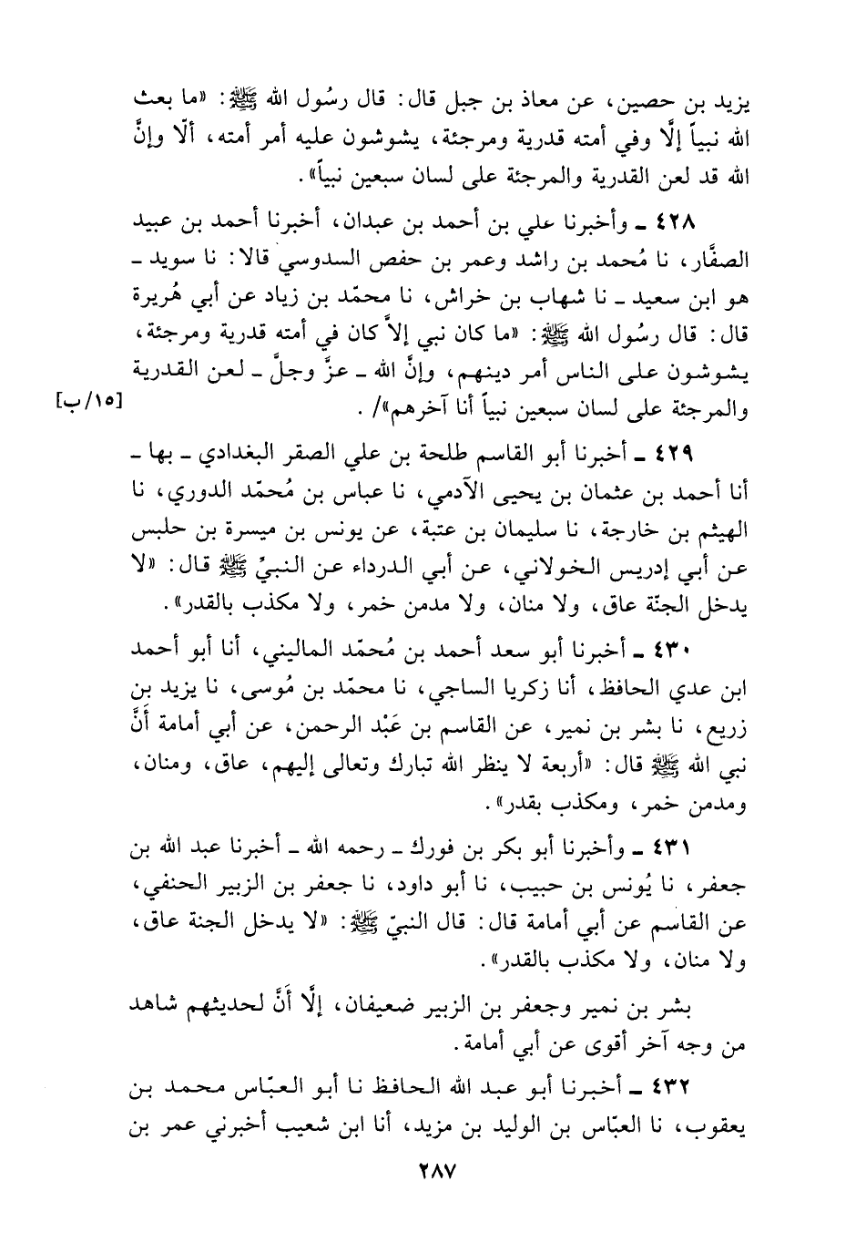 430 - أَخْبَرَنَا أَبُو سَعْدٍ أَحْمَدُ بْنُ مُحَمَّدٍ الْمَالِينِيُّ , أنا أَبُو أَحْمَدَ بْنُ عَدِيٍّ الْحَافِظُ , أنا زَكَرِيَّا السَّاجِيُّ , نا مُحَمَّدُ بْنُ مُوسَى , نا يَزِيدُ بْنُ زُرَيْعٍ , نا بِشْرُ بْنُ نُمَيْرٍ , عَنِ الْقَاسِمِ بْنِ عَبْدِ الرَّحْمَنِ , عَنْ أَبِي أُمَامَةَ أَنَّ نَبِيَّ اللَّهِ صَلَّى اللهُ عَلَيْهِ وَسَلَّمَ قَالَ: §«أَرْبَعَةٌ لَا يَنْظُرُ اللَّهُ تَبَارَكَ وَتَعَالَى إِلَيْهِمْ , عَاقٌّ , وَمَنَّانٌ , وَمُدْمِنُ خَمْرٍ , وَمُكَذِّبٌ بِقَدَرٍ»