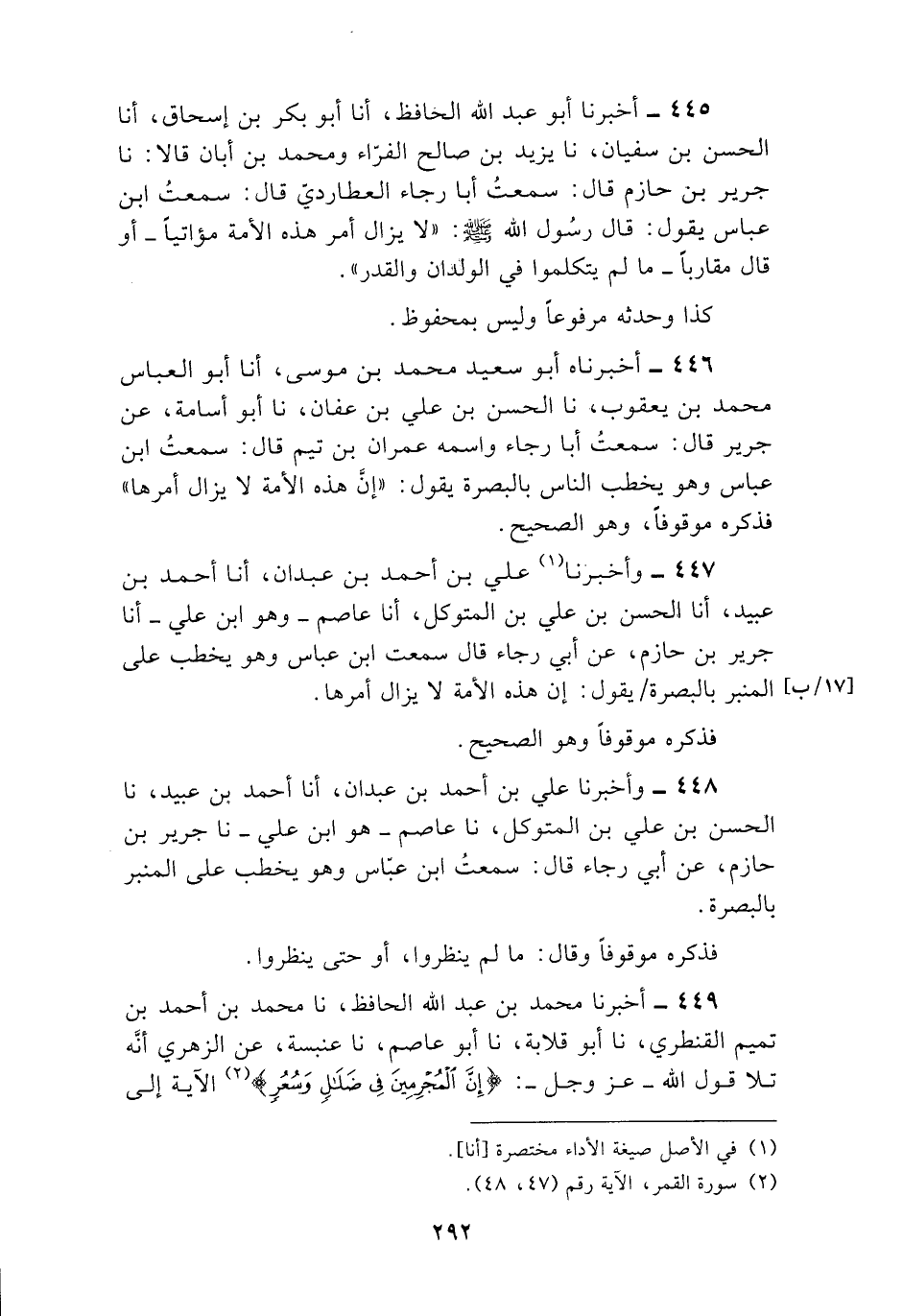 445 - أَخْبَرَنَا أَبُو عَبْدِ اللَّهِ الْحَافِظُ , أنا أَبُو بَكْرِ بْنُ إِسْحَاقَ , أنا الْحَسَنُ بْنُ سُفْيَانَ , نا يَزِيدُ بْنُ صَالِحٍ الْفَرَّاءُ , وَمُحَمَّدُ بْنُ أَبَانَ , قَالَا: نا جَرِيرُ بْنُ حَازِمٍ , قَالَ: سَمِعْتُ أَبَا رَجَاءٍ الْعُطَارِدِيَّ , قَالَ: سَمِعْتُ ابْنَ عَبَّاسٍ , يَقُولُ: قَالَ رَسُولُ اللَّهِ صَلَّى اللهُ عَلَيْهِ وَسَلَّمَ §«لَا يَزَالُ أَمْرُ هَذِهِ الْأُمَّةِ مُؤَاتِيًا - أَوْ قَالَ - مُقَارِبًا مَا لَمْ يَتَكَلَّمُوا فِي الْوِلْدَانِ وَالْقَدَرِ» كَذَا وَحَدَّثَهُ مَرْفُوعًا وَلَيْسَ بِمَحْفُوظٍ