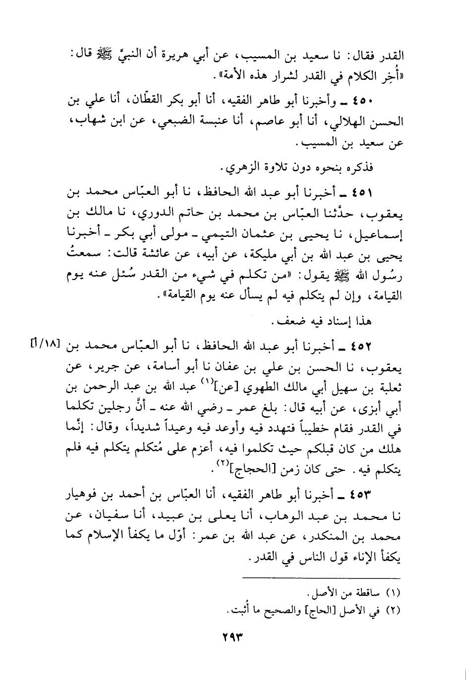 452 - أَخْبَرَنَا أَبُو عَبْدِ اللَّهِ الْحَافِظُ , نا أَبُو الْعَبَّاسِ مُحَمَّدُ بْنُ يَعْقُوبَ , نا الْحَسَنُ بْنُ عَلِيِّ بْنِ عَفَّانَ , نا أَبُو أُسَامَةَ , عَنْ جَرِيرٍ , عَنْ ثَعْلَبَةَ بْنِ سُهَيْلٍ أَبِي مَالِكٍ الطُّهَوِيِّ , عَنْ عَبْدِ اللَّهِ بْنِ عَبْدِ الرَّحْمَنِ بْنِ أَبِي أَبْزَى , عَنْ أَبِيهِ , قَالَ: بَلَغَ عُمَرَ رَضِيَ اللَّهُ عَنْهُ أَنَّ رَجُلَيْنِ تَكَلَّمَا فِي الْقَدَرِ فَقَامَ خَطِيبًا فَتَهَدَّدَ فِيهِ وَأَوْعَدَ فِيهِ وَعِيدًا شَدِيدًا , وَقَالَ: «إِنَّمَا §هَلَكَ مَنْ كَانَ قَبْلَكُمْ حَيْثُ تَكَلَّمُوا فِيهِ , أَعْزِمُ عَلَى مُتَكَلِّمٍ يَتَكَلَّمُ فِيهِ فَلَمْ يَتَكَلَّمْ فِيهِ. حَتَّى كَانَ زَمَنُ الْحَجَّاجِ»