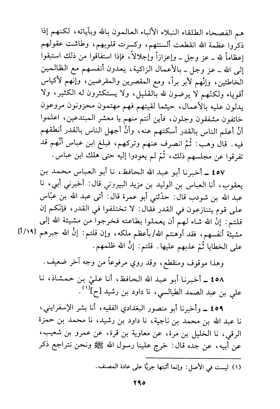 459 - وَأَخْبَرَنَا أَبُو مَنْصُورٍ الْبَغْدَادِيُّ الْفَقِيهُ , أنا بِشْرٌ الْإِسْفَرَايِينِيُّ , نا عَبْدُ اللَّهِ بْنُ مُحَمَّدِ بْنِ نَاجِيَةَ , نا دَاوُدُ بْنُ رُشَيْدٍ , نا مُحَمَّدُ بْنُ حَمْزَةَ الرَّقِّيُّ , نا الْخَلِيلُ بْنُ مُرَّةَ , عَنْ مُعَاوِيَةَ بْنِ قُرَّةَ , عَنْ عَمْرِو بْنِ شُعَيْبٍ , عَنْ أَبِيهِ , عَنْ جَدَّهُ قَالَ: خَرَجَ عَلَيْنَا رَسُولُ اللَّهِ صَلَّى اللهُ عَلَيْهِ وَسَلَّمَ وَنَحْنُ نَتَرَاجَعُ ذِكْرَ -[296]- الْقَدَرِ , فَخَرَجَ عَلَيْنَا وَكَأَنَّمَا فُقِئَ فِي وَجْهِهِ حَبُّ الرُّمَّانِ فَقَالَ: «أَلِهَذَا خُلِقْتُمْ؟ أَمْ بِهَذَا أُمِرْتُمْ؟ أَلَيْسَ إِنَّمَا هَلَكَ الَّذِينَ مِنْ قَبْلِكُمْ بِهَذَا وَأَشْبَاهِهِ؟ §فَمَنْ زَعَمَ أَنَّ اللَّهَ جَبَلَ الْعِبَادَ عَلَى الْمَعَاصِي ثُمَّ عَاتَبَهُمْ عَلَيْهَا كَمَنْ زَعَمَ أَنَّ اللَّهَ عَزَّ وَجَلَّ كَلَّفَ الْعِبَادَ مَا لَا يُطِيقُونَ , وَمَنْ زَعَمَ أَنَّ اللَّهَ لَا يَعْلَمُ مَا الْعِبَادُ عَامِلُونَ , وَمَا هُمْ إِلَيْهِ صَائِرُونَ فَقَدْ أَخْرَجَ اللَّهَ مِنْ قُدْرَتِهِ» لَفْظُ حَدِيثِ الطَّيَالِسِيِّ , وَفِي رِوَايَةِ ابْنِ نَاجِيَةَ «جَبَرَ الْعِبَادَ عَلَى الْمَعَاصِي ثُمَّ عَذَّبَهُمْ» وَهَذَا يَنْفَرِدُ بِهِ الْخَلِيلُ بْنُ مُرَّةَ هَكَذَا , وَهُوَ ضَعِيفٌ إِنَّمَا رَوَاهُ الثِّقَاتُ كَمَا مَضَى فِي صَدْرِ هَذَا الْبَابِ وَاللَّهُ أَعْلَمُ