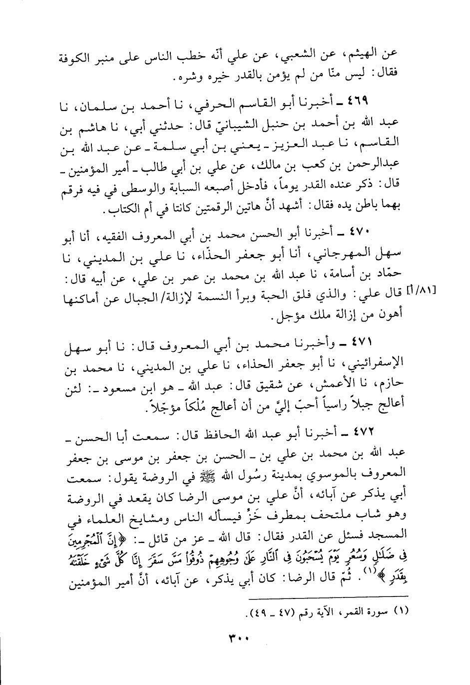 469 - أَخْبَرَنَا أَبُو الْقَاسِمِ الْحَرْفِيُّ , نا أَحْمَدُ بْنُ سَلْمَانَ , نا عَبْدُ اللَّهِ بْنُ أَحْمَدَ بْنِ حَنْبَلٍ الشَّيْبَانِيُّ , قَالَ: حَدَّثَنِي أَبِي , نا هَاشِمُ بْنُ الْقَاسِمِ , نا عَبْدُ الْعَزِيزِ يَعْنِي ابْنَ أَبِي سَلَمَةَ , عَنْ عَبْدِ اللَّهِ بْنِ عَبْدِ الرَّحْمَنِ بْنِ كَعْبِ بْنِ مَالِكٍ , عَنْ عَلِيِّ بْنِ أَبِي طَالِبٍ , أَمِيرِ الْمُؤْمِنِينَ قَالَ: ذُكِرَ عِنْدَهُ الْقَدَرُ يَوْمًا , فَأَدْخَلَ أَصْبُعَهُ السَّبَّابَةَ وَالْوُسْطَى فِي فِيهِ فَرَقَّمَ بِهِمَا بَاطِنَ يَدِهِ فَقَالَ: §«أَشْهَدُ أَنَّ هَاتَيْنِ الرَّقْمَتَيْنِ كَانَتَا فِي أُمِّ الْكِتَابِ»
