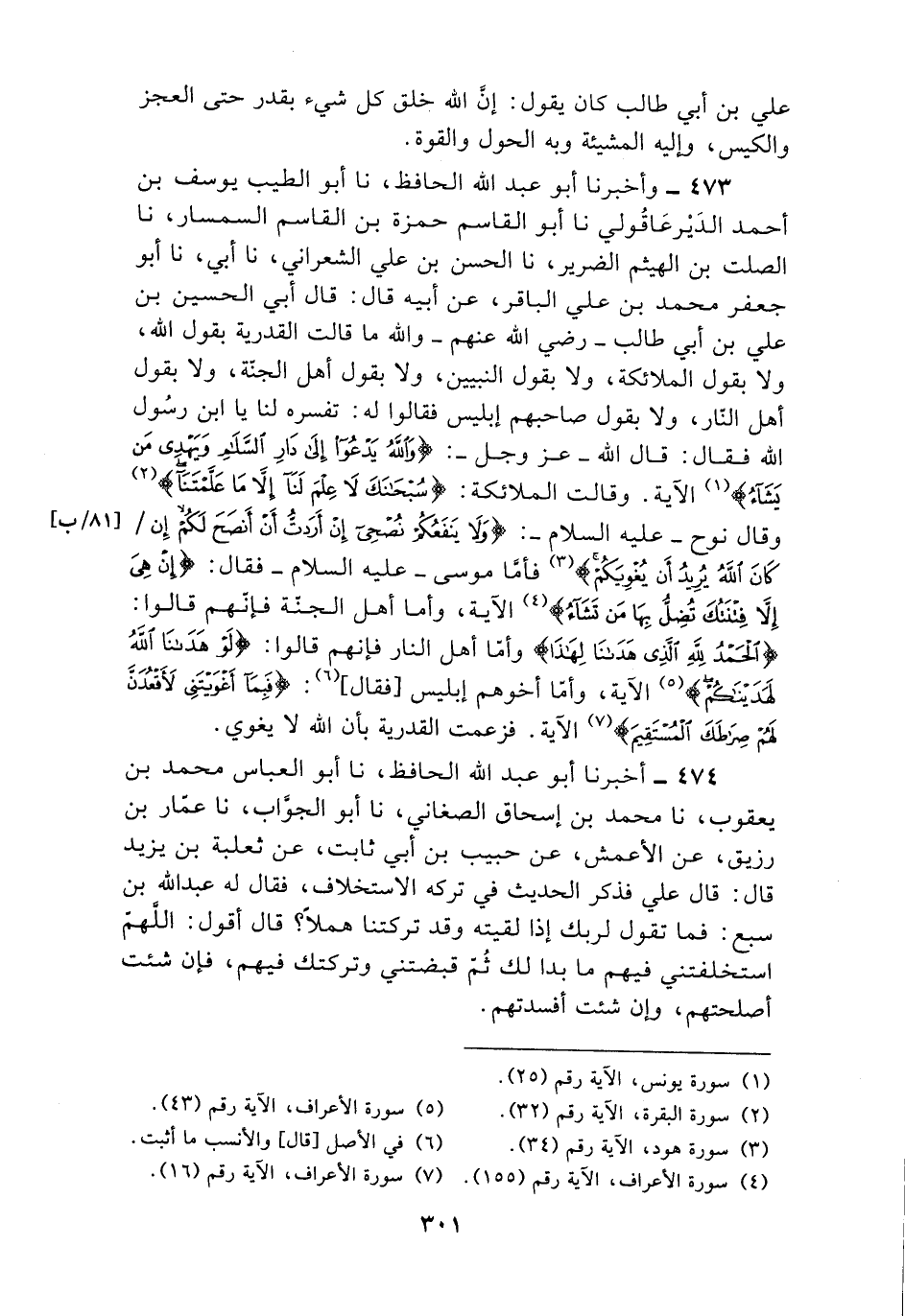 473 - وَأَخْبَرَنَا أَبُو عَبْدِ اللَّهِ الْحَافِظُ , نا أَبُو الطَّيِّبِ يُوسُفُ بْنُ أَحْمَدَ الدَّيْرُعَاقُولِيُّ , نا أَبُو الْقَاسِمِ حَمْزَةُ بْنُ الْقَاسِمِ السِّمْسَارُ , نا الصَّلْتُ بْنُ الْهَيْثَمِ الضَّرِيرُ , نا الْحَسَنُ بْنُ عَلِيٍّ الشَّعْرَانِيُّ , نا أَبِي , نا أَبُو جَعْفَرٍ مُحَمَّدُ بْنُ عَلِيٍّ الْبَاقِرُ , عَنْ أَبِيهِ , قَالَ: قَالَ أَبِي الْحُسَيْنُ بْنُ عَلِيِّ بْنِ أَبِي طَالِبٍ رَضِيَ اللَّهُ عَنْهُمْ " وَاللَّهِ §مَا قَالَتِ الْقَدَرِيَّةُ بِقَوْلِ اللَّهِ , وَلَا بِقَوْلِ الْمَلَائِكَةِ , وَلَا بِقَوْلِ النَّبِيِّينَ , وَلَا بِقَوْلِ أَهْلِ الْجَنَّةِ , وَلَا بِقَوْلِ أَهْلِ النَّارِ , وَلَا بِقَوْلِ صَاحِبِهِمْ إِبْلِيسَ فَقَالُوا لَهُ: تُفَسِّرُهُ لَنَا يَا ابْنَ رَسُولِ اللَّهِ فَقَالَ: قَالَ اللَّهُ عَزَّ وَجَلَّ: وَاللَّهُ يَدْعُو إِلَى دَارِ السَّلَامِ وَيَهْدِي مَنْ يَشَاءُ الْآيَةُ , وَقَالَتِ الْمَلَائِكَةُ: سُبْحَانَكَ لَا عِلْمَ لَنَا إِلَّا مَا عَلَّمْتَنَا وَقَالَ نُوحٌ عَلَيْهِ السَّلَامُ: وَلَا يَنْفَعُكُمْ نُصْحِي إِنْ أَرَدْتُ أَنْ أَنْصَحَ لَكُمْ إِنْ كَانَ اللَّهُ يُرِيدُ أَنْ يُغْوِيَكُمْ فَأَمَّا مُوسَى عَلَيْهِ السَّلَامُ فَقَالَ: إِنْ هِيَ إِلَّا فِتْنَتُكَ تُضِلُّ بِهَا مَنْ تَشَاءُ الْآيَةَ , وَأَمَّا أَهْلُ الْجَنَّةِ فَإِنَّهُمْ قَالُوا: الْحَمْدُ لِلَّهِ الَّذِي هَدَانَا لِهَذَا وَأَمَّا أَهْلُ النَّارِ فَإِنَّهُمْ قَالُوا: لَوْ هَدَانَا اللَّهُ لَهَدَيْنَاكُمْ الْآيَةَ , وَأَمَّا أَخُوهُمْ إِبْلِيسُ فَقَالَ: فَبِمَا أَغْوَيْتَنِي لَأَقْعُدَنَّ لَهُمْ صِرَاطَكَ الْمُسْتَقِيمَ الْآيَةَ. فَزَعَمَتِ الْقَدَرِيَّةُ بِأَنَّ اللَّهَ لَا يُغْوِي "