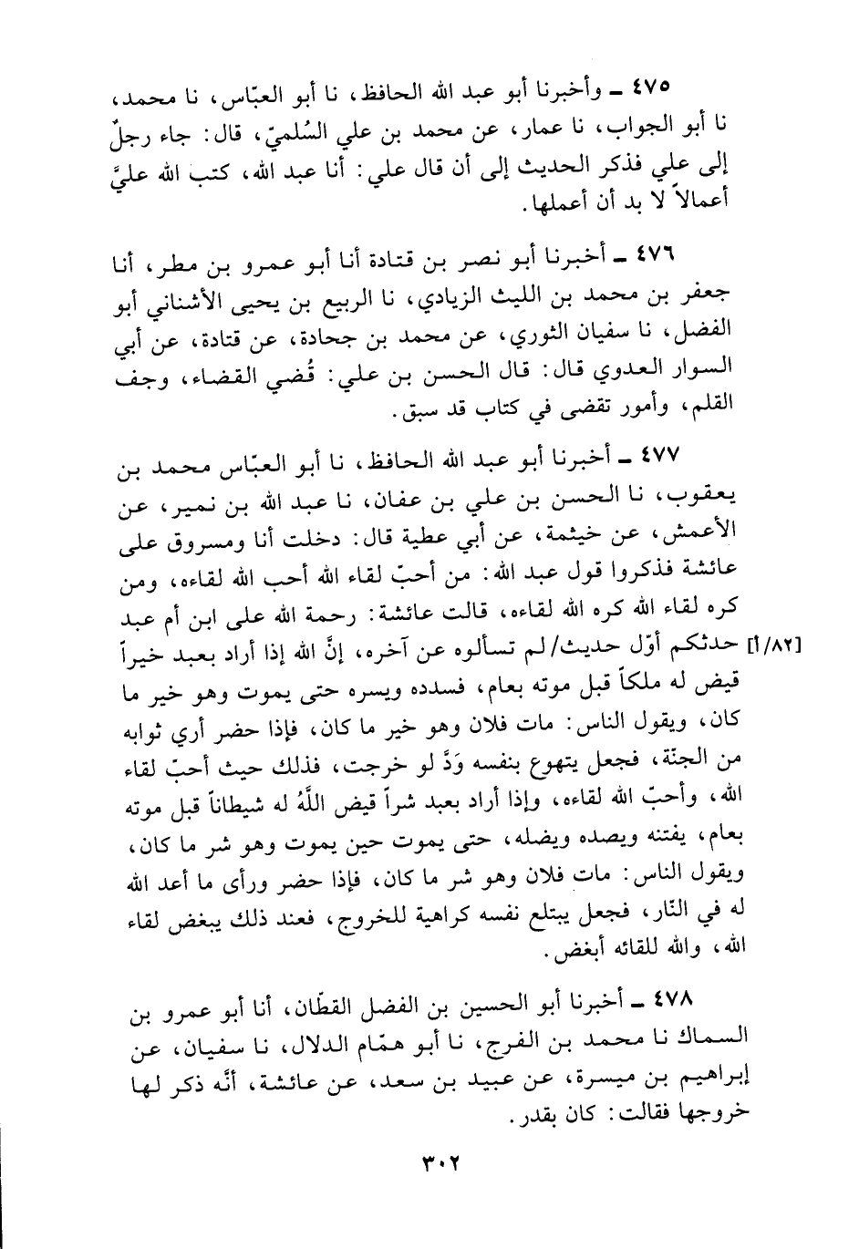 477 - أَخْبَرَنَا أَبُو عَبْدِ اللَّهِ الْحَافِظُ , نا أَبُو الْعَبَّاسِ مُحَمَّدُ بْنُ يَعْقُوبَ , نا الْحَسَنُ بْنُ عَلِيِّ بْنِ عَفَّانَ , نا عَبْدُ اللَّهِ بْنُ نُمَيْرٍ , عَنِ الْأَعْمَشِ , عَنْ خَيْثَمَةَ , عَنْ أَبِي عَطِيَّةَ , قَالَ: دَخَلْتُ أَنَا وَمَسْرُوقٌ عَلَى عَائِشَةَ فَذَكَرُوا قَوْلَ عَبْدِ اللَّهِ: مَنْ أَحَبَّ لِقَاءَ اللَّهِ أَحَبَّ اللَّهُ لِقَاءَهُ , وَمَنْ كَرِهَ لِقَاءَ اللَّهِ كَرِهَ اللَّهُ لِقَاءَهُ , قَالَتْ عَائِشَةُ: " رَحْمَةُ اللَّهِ عَلَى ابْنِ أُمِّ عَبْدٍ حَدَّثَكُمْ أَوَّلَ حَدِيثٍ لَمْ تَسْأَلُوهُ عَنْ آخِرِهِ , إِنَّ اللَّهَ §إِذَا أَرَادَ بِعَبْدٍ خَيْرًا قَيَّضَ لَهُ مَلَكًا قَبْلَ مَوْتِهِ بِعَامٍ , فَسَدَّدَهُ وَيَسَّرَهُ حَتَّى يَمُوتَ وَهُوَ خَيْرُ مَا كَانَ , وَيَقُولُ النَّاسُ: مَاتَ فُلَانٌ وَهُوَ خَيْرُ مَا كَانَ , فَإِذَا حَضَرَ أُرِيَ ثَوَابَهُ مِنَ الْجَنَّةِ , فَجَعَلَ يَتَهَوَّعُ بِنَفْسِهِ وَدَّ لَوْ خَرَجَتْ , فَذَلِكَ حَيْثُ أَحَبَّ لِقَاءَ اللَّهِ , وَأَحَبَّ اللَّهُ لِقَاءَهُ , وَإِذَا أَرَادَ بِعَبْدٍ شَرًّا قَيَّضَ اللَّهُ لَهُ شَيْطَانًا قَبْلَ مَوْتِهِ بِعَامٍ , يَفْتِنُهُ وَيَصُدُّهُ وَيُضِلُّهُ , حَتَّى يَمُوتَ حِينَ يَمُوتُ وَهُوَ شَرُّ مَا كَانَ , وَيَقُولُ النَّاسُ: مَاتَ فُلَانٌ وَهُوَ شَرُّ مَا كَانَ , فَإِذَا حَضَرَ وَرَأَى مَا أَعَدَّ اللَّهُ لَهُ فِي النَّارِ , فَجَعَلَ يَبْتَلِعُ نَفْسَهُ كَرَاهِيَةً لِلْخُرُوجٍ , فَعِنْدَ ذَلِكَ يُبْغِضُ لِقَاءَ اللَّهِ , وَاللَّهُ لِلِقَائِهِ أَبْغَضُ "