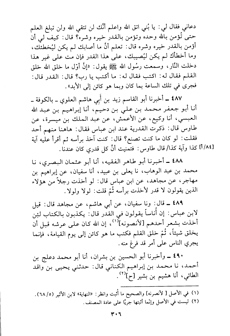 489 - قَالَ: ونا سُفْيَانُ , عَنْ أَبِي هَاشِمٍ , عَنْ مُجَاهِدٍ , قَالَ: قِيلَ لِابْنِ عَبَّاسٍ: إِنَّ أُنَاسًا يَقُولُونَ فِي الْقَدَرِ قَالَ: §«يُكَذِّبُونَ بِالْكِتَابِ لَئِنْ أَخَذْتُ بِشَعْرِ أَحَدِهِمْ لَأَنْصُوَنَّهُ إِنَّ اللَّهَ كَانَ عَلَى عَرْشِهِ قَبْلَ أَنْ يَخْلُقَ شَيْئًا , ثُمَّ خَلَقَ الْقَلَمَ فَكَتَبَ مَا هُوَ كَائِنٌ إِلَى يَوْمِ الْقِيَامَةِ , فَإِنَّمَا يَجْرِي النَّاسُ عَلَى أَمْرٍ قَدْ فُرِغَ مِنْهُ»