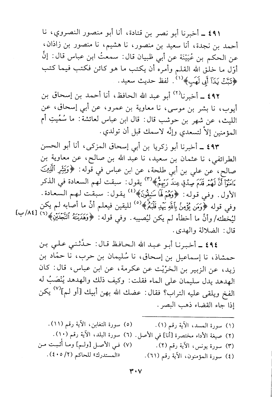 493 - أَخْبَرَنَا أَبُو زَكَرِيَّا بْنُ أَبِي إِسْحَاقَ الْمُزَكِّيُّ , أنا أَبُو الْحَسَنِ الطَّرَائِفِيُّ , نا عُثْمَانُ بْنُ سَعِيدٍ , نا عَبْدُ اللَّهِ بْنُ صَالِحٍ , عَنْ مُعَاوِيَةَ بْنِ صَالِحٍ , عَنْ عَلِيِّ بْنِ أَبِي طَلْحَةَ , عَنِ ابْنِ عَبَّاسٍ , فِي قَوْلِهِ: {§وَبِشِّرِ الَّذِينَ آمَنُوا أَنَّ لَهُمْ قَدَمَ صِدْقٍ عِنْدَ رَبِّهِمْ} [يونس: 2] يَقُولُ: " سَبَقَتْ لَهُمُ السَّعَادَةُ فِي الذِّكْرِ الْأَوَّلِ , وَفِي قَوْلِهِ تَعَالَى {وَهُمْ لَهَا سَابِقُونَ} [المؤمنون: 61] , يَقُولُ: سَبَقَتْ لَهُمُ السَّعَادَةُ " وَفِي وَقَوْلُهُ: {وَمَنْ يُؤْمِنْ بِاللَّهِ يَهْدِ قَلْبَهُ} [التغابن: 11] «لِلْيَقِينِ فَيَعْلَمُ أَنَّ مَا أَصَابَهُ لَمْ يَكُنْ لِيُخْطِئَهُ وَأَنَّ مَا أَخْطَأَهُ لَمْ يَكُنْ لِيُصِيبَهُ» , وَفِي قَوْلِهِ: {وَهَدَيْنَاهُ النَّجْدَيْنِ} [البلد: 10] قَالَ: «الضَّلَالَةُ وَالْهُدَى»