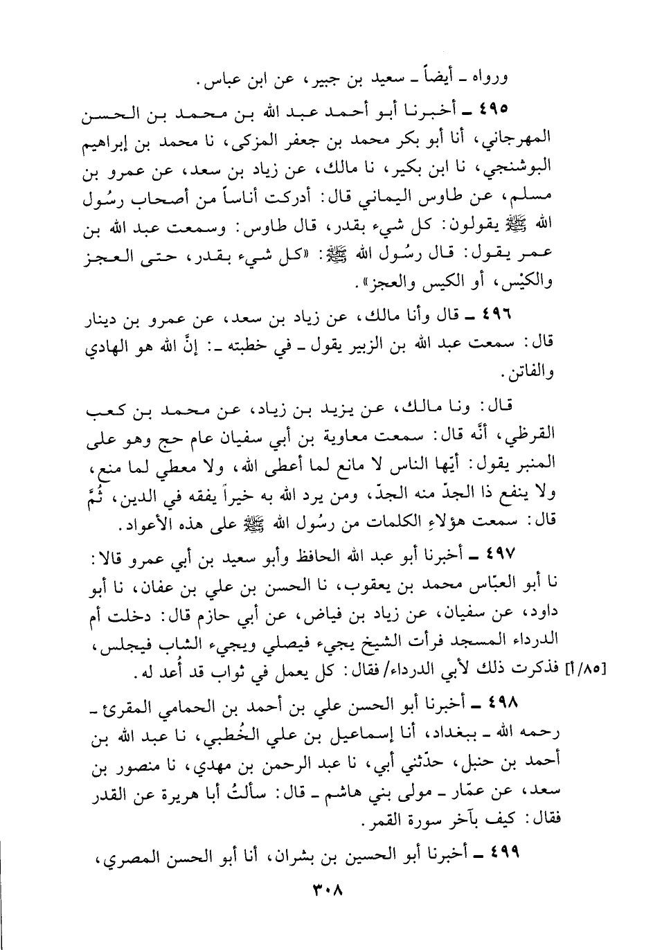 495 - أَخْبَرَنَا أَبُو أَحْمَدَ عَبْدُ اللَّهِ بْنُ مُحَمَّدِ بْنِ الْحَسَنِ الْمِهْرَجَانِيُّ , أنا أَبُو بَكْرٍ مُحَمَّدُ بْنُ جَعْفَرٍ الْمُزَكِّيُّ , نا مُحَمَّدُ بْنُ إِبْرَاهِيمَ الْبُوشَنْجِيُّ , نا ابْنُ بُكَيْرٍ , نا مَالِكٌ , عَنْ زِيَادِ بْنِ سَعْدٍ , عَنْ عَمْرِو بْنِ مُسْلِمٍ , عَنِ طَاوُسٍ الْيَمَانِيِّ , قَالَ: " أَدْرَكْتُ أُنَاسًا مِنْ أَصْحَابِ رَسُولِ اللَّهِ صَلَّى اللهُ عَلَيْهِ وَسَلَّمَ يَقُولُونَ: §كُلُّ شَيْءٍ بِقَدَرٍ "