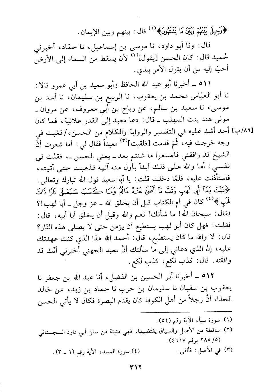 511 - أَخْبَرَنَا أَبُو عَبْدِ اللَّهِ الْحَافِظُ , وَأَبُو سَعِيدِ بْنُ أَبِي عَمْرٍو , قَالَا: نا أَبُو الْعَبَّاسِ مُحَمَّدُ بْنُ يَعْقُوبَ , نا الرَّبِيعُ بْنُ سُلَيْمَانَ , نا أَسَدُ بْنُ مُوسَى , نا سَعِيدُ بْنُ سَالِمٍ , عَنْ رَبَاحِ بْنِ أَبِي مَعْرُوفٍ , عَنْ مَرْوَانَ , مَوْلَى هِنْدَ بِنْتِ الْمُهَلَّبِ قَالَ: دَعَا مَعْبَدٌ إِلَى الْقَدَرِ عَلَانِيَةً , فَمَا كَانَ أَحَدٌ أَشَدَّ عَلَيْهِ فِي التَّفْسِيرِ وَالرِّوَايَةِ وَالْكَلَامِ مِنَ الْحَسَنِ , فَغِبْتُ فِي وَجْهٍ خَرَجْتُ فِيهِ , ثُمَّ قَدِمْتُ فَلَقِيتُ مَعْبَدًا , فَقَالَ لِي: أَمَا شَعَرْتَ أَنَّ الشَّيْخَ قَدْ وَافَقَنِي , فَاصْنَعُوا مَا شِئْتُمْ بَعْدُ , يَعْنِي الْحَسَنَ , فَقُلْتُ فِي نَفْسِي: أَمَا وَاللَّهِ عَلَى ذَلِكَ أَبْدَأُ بِأَوَّلِ مِنْهُ آتِيهِ , فَذَهَبْتُ حَتَّى أَتَيْتُهُ , فَاسْتَأْذَنْتُ عَلَيْهِ , فَلَمَّا دَخَلْتُ قُلْتُ: يَا أَبَا سَعِيدٍ , قَوْلُ اللَّهِ تَبَارَكَ وَتَعَالَى: {تَبَّتْ يَدَا أَبِي لَهَبٍ وَتَبَّ مَا أَغْنَى عَنْهُ مَالُهُ وَمَا كَسَبَ سَيَصْلَى نَارًا ذَاتَ لَهَبٍ} [المسد: 2] , كَانَ فِي أُمِّ الْكِتَابِ قَبْلَ أَنْ يَخْلُقَ اللَّهُ عَزَّ وَجَلَّ أَبَا لَهَبٍ؟ فَقَالَ: «سُبْحَانَ اللَّهِ مَا شَأْنُكَ نَعَمْ وَاللَّهِ وَقَبْلَ أَنْ يَخْلُقَ أَبَا أَبِيهِ» قَالَ: فَقُلْتُ: فَهَلْ كَانَ أَبُو لَهَبٍ يَسْتَطِيعُ أَنْ يُؤْمِنَ حَتَّى لَا يَصْلَى هَذِهِ النَّارَ؟ قَالَ: «لَا وَاللَّهِ مَا كَانَ يَسْتَطِيعُ» قَالَ: أَحْمَدُ اللَّهَ هَذَا الَّذِي كُنْتُ عَهِدْتُكَ عَلَيْهِ , إِنَّ الَّذِي دَعَانِي إِلَى مَا سَأَلْتُكَ أَنَّ مَعْبَدًا الْجُهَنِيَّ أَخْبَرَنِي أَنَّكَ قَدْ وَافَقْتَهُ , قَالَ: §«كَذَبَ لُكَعٌ , كَذَبَ لُكَعٌ»