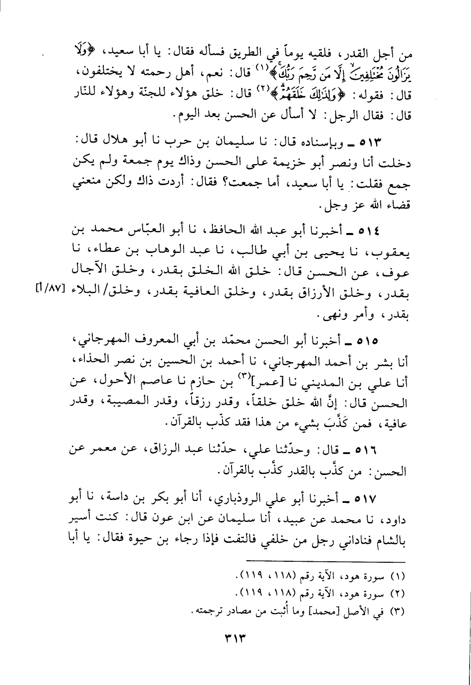 515 - أَخْبَرَنَا أَبُو الْحَسَنِ مُحَمَّدُ بْنُ أَبِي الْمَعْرُوفِ الْمِهْرَجَانِيُّ , أنا بِشْرُ بْنُ أَحْمَدَ الْمِهْرَجَانِيُّ , نا أَحْمَدُ بْنُ الْحُسَيْنِ بْنِ نَصْرٍ الْحَذَّاءُ , أنا عَلِيُّ بْنُ الْمَدِينِيِّ , نا عُمَرُ بْنُ حَازِمٍ , نا عَاصِمٌ الْأَحْوَلُ , عَنِ الْحَسَنِ , قَالَ: «إِنَّ اللَّهَ §خَلَقَ خَلْقًا , وَقَدَّرَ رِزْقًا , وَقَدَّرَ الْمُصِيبَةَ , وَقَدَّرَ عَافِيَةً , فَمَنْ كَذَّبَ بِشَيْءٍ مِنْ هَذَا فَقَدْ كَذَّبَ بِالْقُرْآنِ»