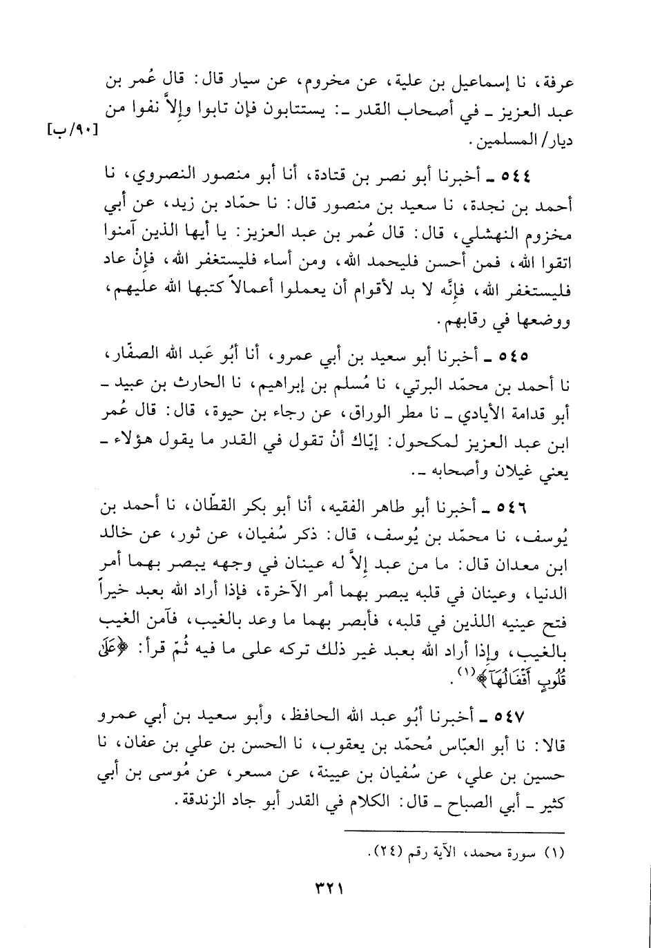545 - أَخْبَرَنَا أَبُو سَعِيدِ بْنُ أَبِي عَمْرٍو , أنا أَبُو عَبْدِ اللَّهِ الصَّفَّارُ , نا أَحْمَدُ بْنُ مُحَمَّدٍ الْبِرْتِيُّ , نا مُسْلِمُ بْنُ إِبْرَاهِيمَ , نا الْحَارِثُ بْنُ عُبَيْدٍ أَبُو قُدَامَةَ الْإِيَادِيُّ , نا مَطَرٌ الْوَرَّاقُ , عَنْ رَجَاءِ بْنِ حَيْوَةَ , قَالَ: قَالَ عُمَرُ بْنُ عَبْدِ الْعَزِيزِ لِمَكْحُولٍ: «إِيَّاكَ §أَنْ تَقُولَ فِي الْقَدَرِ مَا يَقُولُ هَؤُلَاءِ» يَعْنِي غَيْلَانَ وَأَصْحَابَهُ