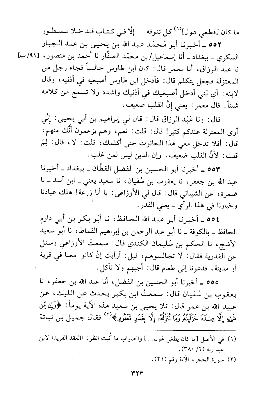 552 - أَخْبَرَنَا أَبُو مُحَمَّدٍ عَبْدُ اللَّهِ بْنُ يَحْيَى بْنِ عَبْدِ الْجَبَّارِ السُّكَّرِيُّ , بِبَغْدَادَ , أنا إِسْمَاعِيلُ بْنُ مُحَمَّدٍ الصَّفَّارُ , نا أَحْمَدُ بْنُ مَنْصُورٍ , نا عَبْدُ الرَّزَّاقِ , أنا مَعْمَرٌ , قَالَ: كَانَ ابْنُ طَاوُسٍ جَالِسًا فَجَاءَ رَجُلٌ مِنَ الْمُعْتَزِلَةِ فَجَعَلَ يَتَكَلَّمُ قَالَ: فَأَدْخَلَ ابْنُ طَاوُسٍ أَصْبُعَيْهِ فِي أُذُنَيْهِ , وَقَالَ لِابْنِهِ: «أَيْ بُنَيَّ §أَدْخِلْ أَصْبُعَيْكَ فِي أُذُنَيْكَ وَاشْدُدْ وَلَا تَسْمَعْ مِنْ كَلَامِهِ شَيْئًا» قَالَ مَعْمَرٌ: يَعْنِي إِنَّ الْقَلْبَ ضَعِيفٌ
