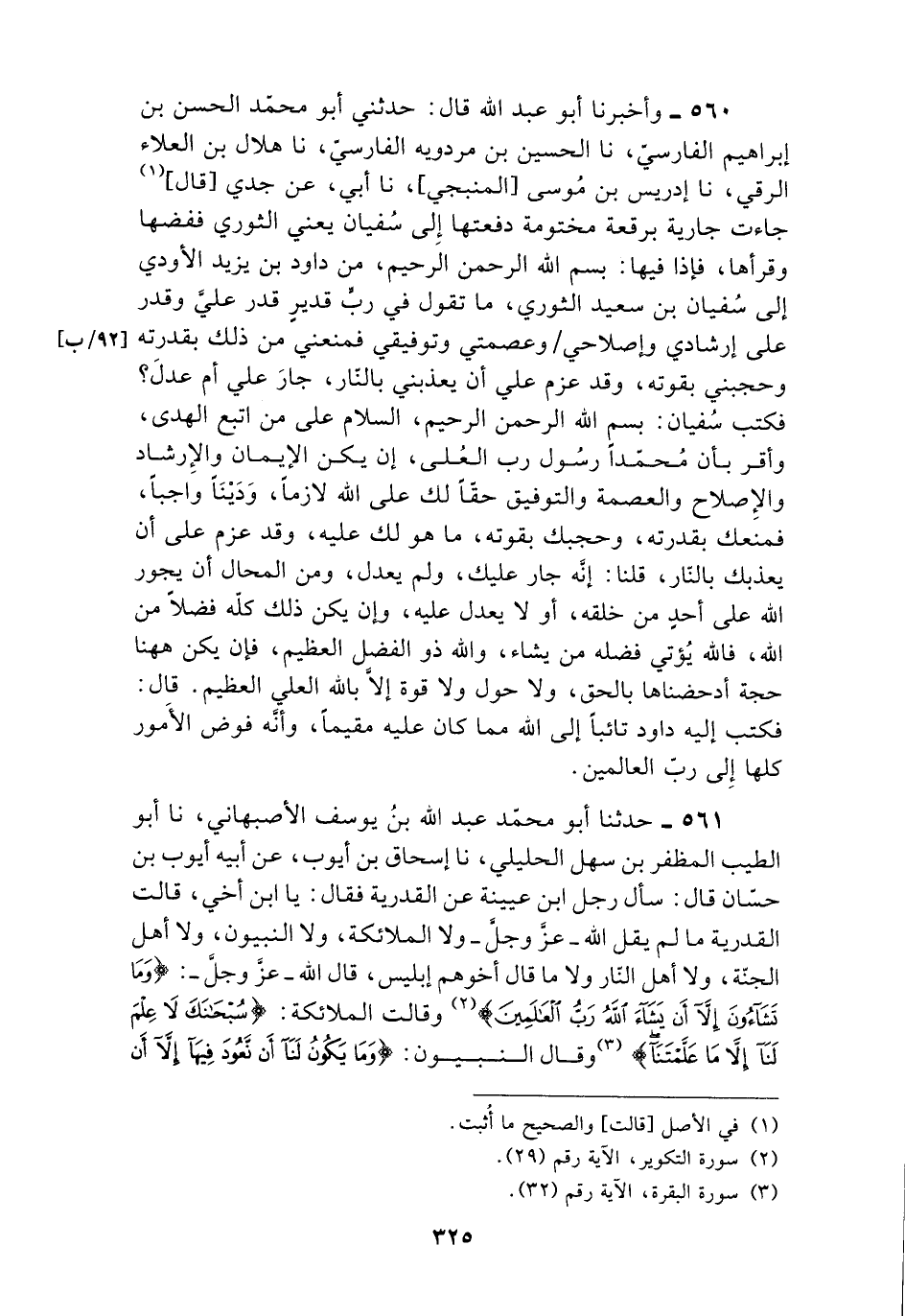 560 - وَأَخْبَرَنَا أَبُو عَبْدِ اللَّهِ , قَالَ: حَدَّثَنِي أَبُو مُحَمَّدٍ الْحَسَنُ بْنُ إِبْرَاهِيمَ الْفَارِسِيُّ , نا الْحُسَيْنُ بْنُ مَرْدَوَيْهِ الْفَارِسِيُّ , نا هِلَالُ بْنُ الْعَلَاءِ الرَّقِّيُّ , نا إِدْرِيسُ بْنُ مُوسَى الْمَنْبِجِيُّ , نا أَبِي , عَنْ جَدِّي , قَالَ: جَاءَتْ جَارِيَةٌ بِرُقْعَةٍ مَخْتُومَةٍ دَفَعَتْهَا إِلَى سُفْيَانَ يَعْنِي الثَّوْرِيَّ فَفَضَّهَا وَقَرَأَهَا , فَإِذَا فِيهَا: بِسْمِ اللَّهِ الرَّحْمَنِ الرَّحِيمِ , مِنْ دَاوُدَ بْنِ يَزِيدَ الْأَوْدِيِّ إِلَى سُفْيَانَ بْنِ سَعِيدٍ الثَّوْرِيِّ , مَا تَقُولُ فِي رَبٍّ قَدِيرٍ قَدَرَ عَلَيَّ , وَقَدَرَ عَلَى إِرْشَادِي وَإِصْلَاحِي وَعِصْمَتِي وَتَوْفِيقِي فَمَنَعَنِي مِنْ ذَلِكَ بِقُدْرَتِهِ وَحَجَبَنِي بِقُوَّتِهِ , وَقَدْ عَزَمَ عَلَيَّ أَنْ يُعَذِّبَنِيَ بِالنَّارِ , جَارَ عَلَيَّ أَمْ عَدَلَ؟ فَكَتَبَ سُفْيَانُ: «بِسْمِ اللَّهِ الرَّحْمَنِ الرَّحِيمِ , السَّلَامُ عَلَى مَنِ اتَّبَعَ الْهُدَى , وَأَقَرَّ بِأَنَّ مُحَمَّدًا رَسُولُ رَبِّ الْعُلَى , §إِنْ يَكُنِ الْإِيمَانُ وَالْإِرْشَادُ وَالْإِصْلَاحُ وَالْعِصْمَةُ وَالتَّوْفِيقُ حَقًّا لَكَ عَلَى اللَّهِ لَازِمًا , وَدَيْنًا وَاجِبًا , فَمَنَعَكَ بِقُدْرَتِهِ , وَحَجَبَكَ بِقُوَّتِهِ مَا هُوَ لَكَ عَلَيْهِ , وَقَدْ عَزَمَ عَلَى أَنْ يُعَذِّبَكَ بِالنَّارِ , قُلْنَا إِنَّهُ جَارَ عَلَيْكَ وَلَمْ يَعْدِلْ وَمِنَ الْمُحَالِ أَنْ يَجُورَ اللَّهُ عَلَى أَحَدٍ مِنْ خَلْقِهِ , أَوْ لَا يَعْدِلَ عَلَيْهِ , وَإِنْ يَكُنْ ذَلِكَ كُلُّهُ فَضْلًا مِنَ اللَّهِ , فَاللَّهُ يُؤْتِي فَضْلَهُ مَنْ يَشَاءُ وَاللَّهُ ذُو الْفَضْلِ الْعَظِيمِ , فَإِنْ يَكُنْ هَهُنَا حُجَّةٌ أَدْحَضْنَاهَا بِالْحَقِّ , وَلَا حَوْلَ وَلَا قُوَّةَ إِلَّا بِاللَّهِ الْعَلِيِّ الْعَظِيمِ» قَالَ: فَكَتَبَ إِلَيْهِ دَاوُدُ تَائِبًا إِلَى اللَّهِ مِمَّا كَانَ عَلَيْهِ مُقِيمًا , وَأَنَّهُ فَوَّضَ الْأُمُورَ كُلَّهَا إِلَى رَبِّ الْعَالَمِينَ