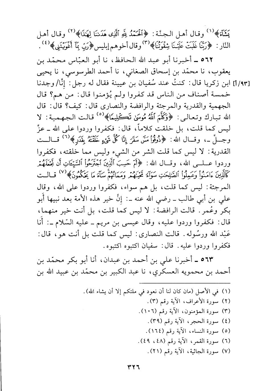 562 - أَخْبَرَنَا أَبُو عَبْدِ اللَّهِ الْحَافِظُ , نا أَبُو الْعَبَّاسِ مُحَمَّدُ بْنُ يَعْقُوبَ , نا مُحَمَّدُ بْنُ إِسْحَاقَ الصَّغَانِيُّ , نا أَحْمَدُ الطُّرَسُوسِيُّ , نا يَحْيَى بْنُ زَكَرِيَّا , قَالَ: كُنْتُ عِنْدَ سُفْيَانَ بْنِ عُيَيْنَةَ فَقَالَ لَهُ رَجُلٌ: إِنَّا §وَجَدْنَا خَمْسَةَ أَصْنَافٍ مِنَ النَّاسِ قَدْ كَفَرُوا وَلَمْ يُؤْمِنُوا قَالَ: «مَنْ هُمْ؟» قَالَ الْجَهْمِيَّةُ , وَالْقَدَرِيَّةُ , وَالْمُرْجِئَةُ , وَالرَّافِضَةُ , وَالنَّصَارَى قَالَ: «كَيْفَ؟» قَالَ: قَالَ اللَّهُ تَبَارَكَ وَتَعَالَى: {وَكَلَّمَ اللَّهُ مُوسَى تَكْلِيمًا} [النساء: 164] قَالَتِ الْجَهْمِيَّةُ: لَا لَيْسَ كَمَا قُلْتَ , بَلْ خَلَقْتَ كَلَامًا , قَالَ: فَكَفَرُوا وَرَدُّوا عَلَى اللَّهِ عَزَّ وَجَلَّ , وَقَالَ اللَّهُ {ذُوقُوا مَسَّ سَقَرَ إِنَّا كُلَّ شَيْءٍ خَلَقْنَاهُ بِقَدَرٍ} [القمر: 49] قَالَتِ الْقَدَرِيَّةُ: لَيْسَ كَمَا قُلْتَ الشَّرُّ مِنَ الشَّيْءِ وَلَيْسَ مِمَّا خَلَقْتَهُ , فَكَفَرُوا وَرَدُّوا عَلَى اللَّهِ , وَقَالَ اللَّهُ: {أَمْ حَسِبَ الَّذِينَ اجْتَرَحُوا السَّيِّئَاتِ أَنْ نَجْعَلَهُمْ كَالَّذِينَ آمَنُوا وَعَمِلُوا الصَّالِحَاتِ سَوَاءً مَحْيَاهُمْ وَمَمَاتُهُمْ سَاءَ مَا يَحْكُمُونَ} [الجاثية: 21] قَالَتِ الْمُرْجِئَةُ: لَيْسَ كَمَا قُلْتَ , بَلْ هُمْ سَوَاءٌ , فَكَفَرُوا وَرَدُّوا عَلَى اللَّهِ , وَقَالَ عَلِيُّ بْنُ أَبِي طَالِبٍ رَضِيَ اللَّهُ عَنْهُ: إِنَّ خَيْرَ هَذِهِ الْأُمَّةِ بَعْدَ نَبِيِّهَا أَبُو بَكْرٍ وَعُمَرُ. قَالَتِ الرَّافِضَةُ: لَا لَيْسَ كَمَا قُلْتَ , بَلْ أَنْتَ خَيْرٌ مِنْهُمَا , قَالَ: فَكَفَرُوا وَرَدُّوا عَلَيْهِ , وَقَالَ عِيسَى بْنُ مَرْيَمَ عَلَيْهِ السَّلَامُ: أَنَا عَبْدُ اللَّهِ وَرَسُولُهُ. قَالَتِ النَّصَارَى: لَيْسَ كَمَا قُلْتَ بَلْ أَنْتَ هُوَ , قَالَ: فَكَفَرُوا وَرَدُّوا عَلَيْهِ. قَالَ: سُفْيَانُ «اكْتُبُوهُ اكْتُبُوهُ»
