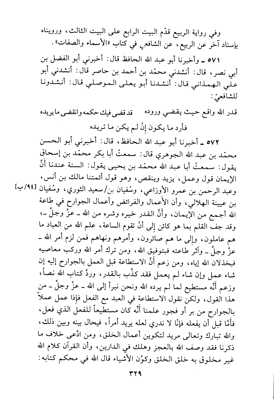 572 - أَخْبَرَنَا أَبُو عَبْدِ اللَّهِ الْحَافِظُ , قَالَ: أَخْبَرَنِي أَبُو الْحَسَنِ مُحَمَّدُ بْنُ عَبْدِ اللَّهِ الْجَوْهَرِيُّ قَالَ: سَمِعْتُ أَبَا بَكْرٍ مُحَمَّدُ بْنُ إِسْحَاقَ يَقُولُ: سَمِعْتُ أَبَا عَبْدِ اللَّهِ مُحَمَّدُ بْنُ يَحْيَى يَقُولُ: §" السُّنَّةُ عِنْدَنَا أَنَّ الْإِيمَانَ , قَوْلٌ وَعَمَلٌ , يَزِيدُ وَيَنْقُصُ , وَهُوَ قَوْلُ أَئِمَّتِنَا مَالِكِ بْنِ أَنَسٍ , وَعَبْدِ الرَّحْمَنِ بْنِ عَمْرٍو الْأَوْزَاعِيِّ , وَسُفْيَانَ بْنِ سَعِيدٍ الثَّوْرِيِّ , وَسُفْيَانَ بْنِ عُيَيْنَةَ الْهِلَالِيِّ , وَأَنَّ الْأَعْمَالَ وَالْفَرَائِضَ وَأَعْمَالَ الْجَوَارِحِ فِي طَاعَةِ اللَّهِ أَجْمَعُ مِنَ الْإِيمَانِ , وَأَنَّ الْقَدَرَ خَيْرَهُ وَشَرَّهُ مِنَ اللَّهِ عَزَّ وَجَلَّ , وَقَدْ جَفَّ الْقَلَمُ بِمَا هُوَ كَائِنٌ إِلَى أَنْ تَقُومَ السَّاعَةُ , عَلِمَ اللَّهُ مِنَ الْعِبَادِ مَا هُمْ عَامِلُونَ , وَإِلَى مَا هُمْ صَائِرُونَ , وَأَمَرَهُمْ وَنَهَاهُمْ فَمَنْ لَزِمَ أَمْرَ اللَّهِ عَزَّ وَجَلَّ وَآثَرَ طَاعَتَهُ فَبِتَوْفِيقِ اللَّهِ , وَمَنْ تَرَكَ أَمْرَ اللَّهِ وَرَكِبَ مَعَاصِيهِ فَبِخِذْلَانِ اللَّهِ إِيَّاهُ , وَمَنْ زَعَمَ أَنَّ الِاسْتِطَاعَةَ قَبْلَ الْعَمَلِ بِالْجَوَارِحِ إِلَيْهِ إِنْ شَاءَ عَمِلَ وَإِنْ شَاءَ لَمْ يَعْمَلْ فَقَدْ كَذَّبَ بِالْقَدَرِ , وَرَدَّ كِتَابَ اللَّهِ نَصًّا , وَزَعَمَ أَنَّهُ مُسْتَطِيعٌ لِمَا لَمْ يُرِدْهُ اللَّهُ وَنَحْنُ نَبْرَأُ إِلَى اللَّهِ عَزَّ وَجَلَّ مِنْ هَذَا الْقَوْلِ , وَلَكِنْ نَقُولُ الِاسْتِطَاعَةُ فِي الْعَبْدِ مَعَ الْفِعْلِ فَإِذَا عَمِلَ عَمَلًا بِالْجَوَارِحِ مِنْ بِرٍّ أَوْ فُجُورٍ عَلِمْنَا أَنَّهُ كَانَ مُسْتَطِيعًا لِلْفِعْلِ الَّذِي فَعَلَ , فَأَمَّا قَبْلَ أَنْ يَفْعَلَهُ فَإِنَّا لَا نَدْرِي لَعَلَّهُ يُرِيدُ أَمْرًا , فَيُحَالُ بَيْنَهُ وَبَيْنَ ذَلِكَ , وَاللَّهُ تَبَارَكَ وَتَعَالَى مُرِيدٌ لِتَكْوِينِ أَعْمَالِ الْخَلْقِ , وَمَنِ ادَّعَى خِلَافَ مَا ذَكَرْنَا فَقَدْ وَصَفَ اللَّهَ بِالْعَجْزِ وَهَلَكَ فِي الدَّارَيْنِ , وَأَنَّ الْقُرْآنَ كَلَامُ اللَّهِ غَيْرُ مَخْلُوقٍ بِهِ خَلَقَ الْخَلْقَ وَكَوَّنَ الْأَشْيَاءَ قَالَ اللَّهُ فِي مُحْكَمِ كِتَابِهِ -[330]-: {أَلَا لَهُ الْخَلْقُ وَالْأَمْرُ} [الأعراف: 54] فَفَصَّلَ الْأَمْرَ مِنَ الْخَلْقِ , فَبِأَمْرِهِ خَلَقَ الْخَلْقَ قَالَ: كُنْ فَكَانَ , وَكَلَامُهُ مِنْ أَمْرِهِ لَيْسَ بِمَخْلُوقٍ , وَأَنَّ اللَّهَ يَرَى فِي الْآخِرَةِ بِالْأَبْصَارِ يَرَاهُ أَهْلُ الْجَنَّةِ , بِهَذَا نُدِينُ اللَّهَ بِصِدْقِ نِيَّةٍ عَلَيْهِ نَحْيَا وَنَمُوتُ إِنْ شَاءَ اللَّهُ , وَأَنَّ خَيْرَ النَّاسِ بَعْدَ رَسُولِ اللَّهِ صَلَّى اللهُ عَلَيْهِ وَسَلَّمَ الْمُقَدَّمُ فِي التَّفْضِيلِ أَبُو بَكْرٍ , ثُمَّ عُمَرُ , ثُمَّ عُثْمَانُ , ثُمَّ عَلِيٌّ "
