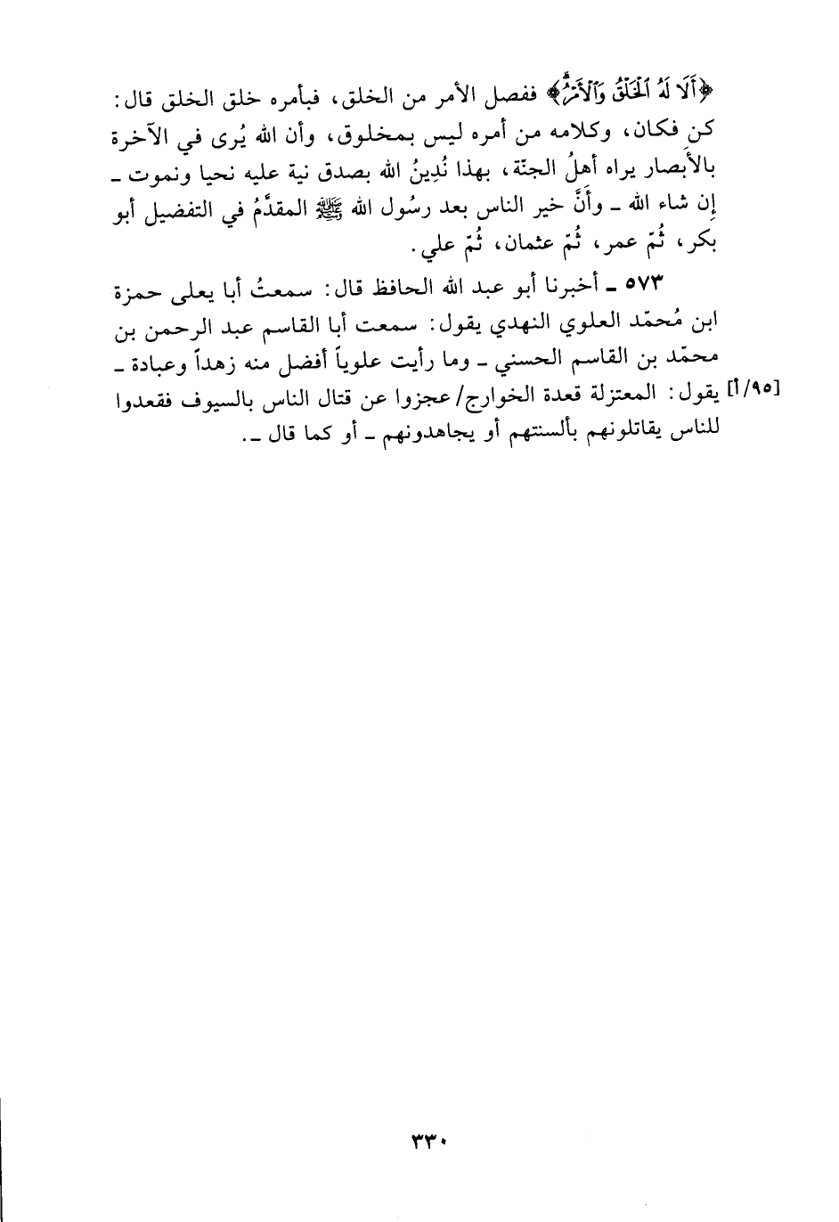 573 - أَخْبَرَنَا أَبُو عَبْدِ اللَّهِ الْحَافِظُ , قَالَ: سَمِعْتُ أَبَا يَعْلَى حَمْزَةَ بْنَ مُحَمَّدٍ الْعَلَوِيَّ النَّهْدِيَّ يَقُولُ: سَمِعْتُ أَبَا الْقَاسِمِ عَبْدَ الرَّحْمَنِ بْنَ مُحَمَّدِ بْنِ الْقَاسِمِ الْحَسَنِيَّ , وَمَا رَأَيْتُ عَلَوِيًّا أَفْضَلَ مِنْهُ زُهْدًا وَعِبَادَةً يَقُولُ: §«الْمُعْتَزِلَةُ قَعْدَةُ الْخَوَارِجِ عَجَزُوا عَنْ قِتَالِ النَّاسِ بِالسُّيُوفِ فَقَعَدُوا لِلنَّاسِ يُقَاتِلُونَهُمْ بِأَلْسِنَتِهِمْ أَوْ يُجَاهِدُونَهُمْ» أَوْ كَمَا قَالَ