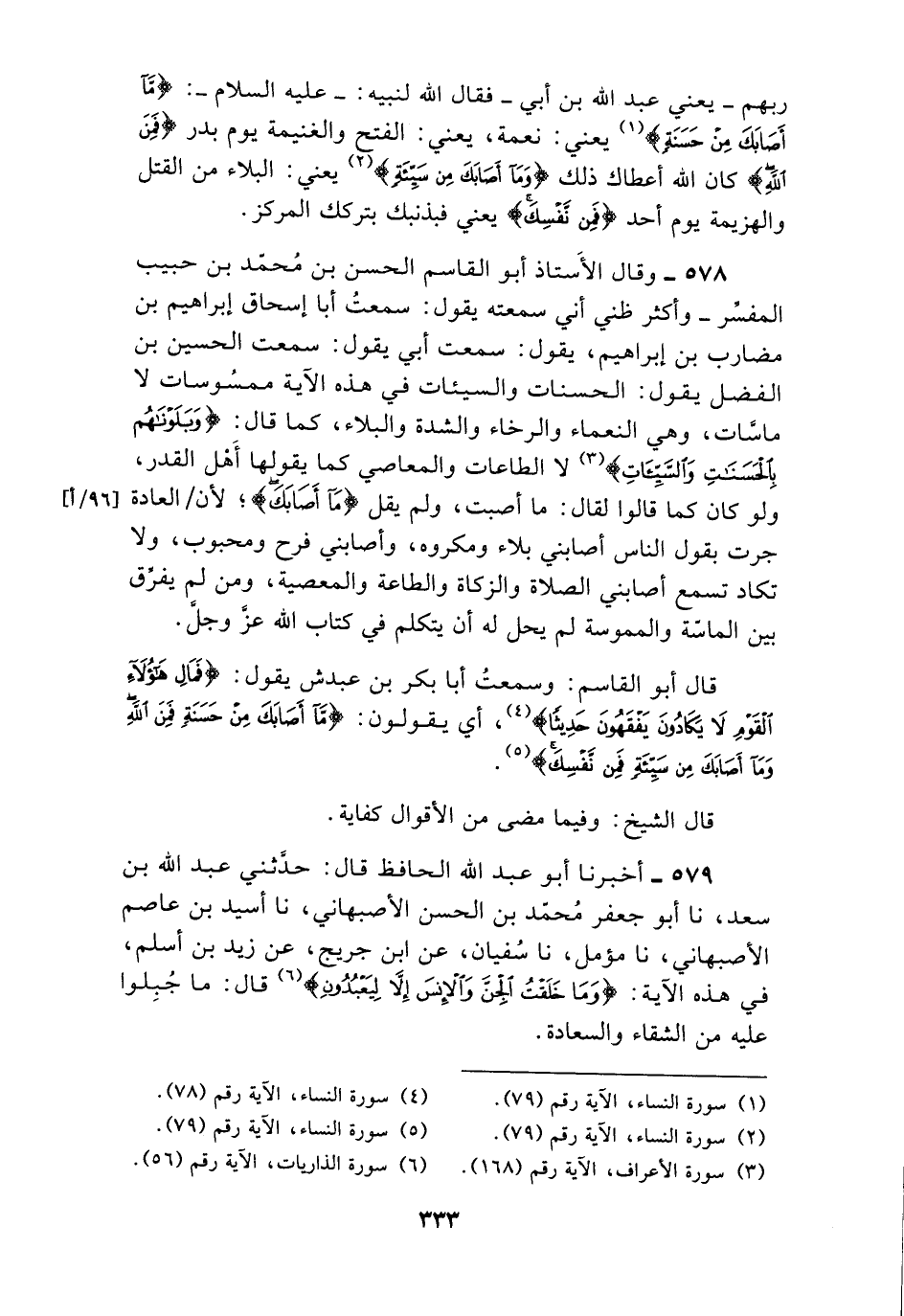 578 - وَقَالَ الْأُسْتَاذُ أَبُو الْقَاسِمِ الْحَسَنُ بْنُ مُحَمَّدِ بْنِ حَبِيبٍ الْمُفَسِّرُ وَأَكْثَرُ ظَنِّي أَنِّي سَمِعْتُهُ يَقُولُ: سَمِعْتُ أَبَا إِسْحَاقَ إِبْرَاهِيمَ بْنَ مُضَارِبِ بْنِ إِبْرَاهِيمَ يَقُولُ: سَمِعْتُ أَبِي يَقُولُ: سَمِعْتُ الْحُسَيْنَ بْنَ الْفَضْلِ , يَقُولُ: §" الْحَسَنَاتُ وَالسَّيِّئَاتُ فِي هَذِهِ الْآيَةِ مَمْسُوسَاتٌ لَا مَاسَّاتٌ , وَهِيَ النَّعْمَاءُ وَالرَّخَاءُ وَالشِّدَّةُ وَالْبَلَاءُ , كَمَا قَالَ: {وَبَلَوْنَاهُمْ بِالْحَسَنَاتِ وَالسَّيِّئَاتِ} [الأعراف: 168] لَا الطَّاعَاتِ وَالْمَعَاصِي كَمَا يَقُولُهَا أَهْلُ الْقَدَرِ , وَلَوْ كَانَ كَمَا قَالُوا لَقَالَ: مَا أَصَبْتَ , وَلَمْ يَقُلْ مَا أَصَابَكَ , لِأَنَّ الْعَادَةَ جَرَتْ بِقَوْلِ النَّاسِ أَصَابَنِي بَلَاءٌ وَمَكْرُوهٌ , وَأَصَابَنِي فَرَحٌ وَمَحْبُوبٌ , وَلَا تَكَادُ تَسْمَعُ أَصَابَنِي الصَّلَاةُ وَالزَّكَاةُ وَالطَّاعَةُ وَالْمَعْصِيَةُ , وَمَنْ لَمْ يُفَرِّقْ بَيْنَ الْمَاسَّةِ , وَالْمَمُوسَةِ لَمْ يَحِلَّ لَهُ أَنْ يَتَكَلَّمَ فِي كِتَابِ اللَّهِ عَزَّ وَجَلَّ "