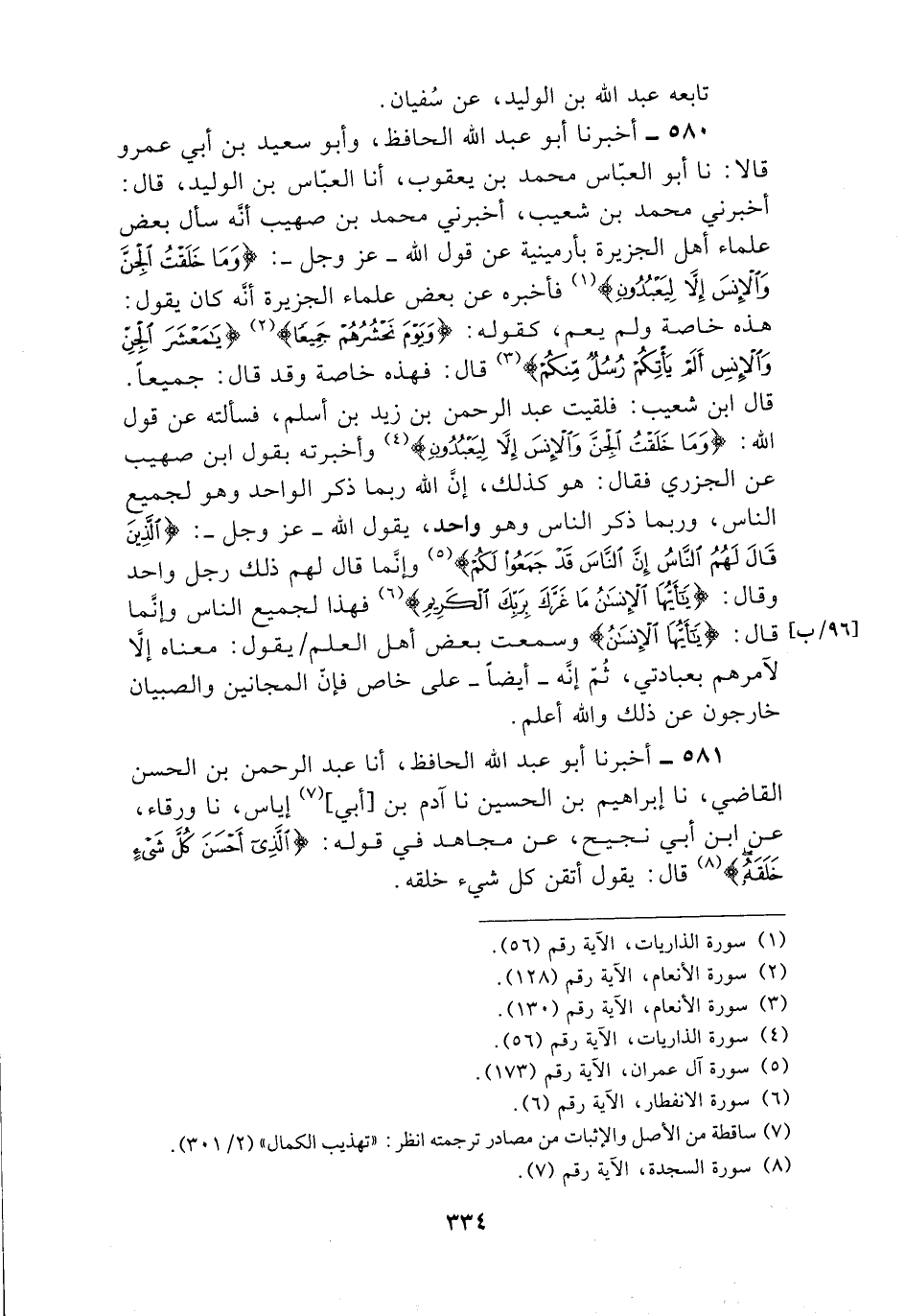 580 - أَخْبَرَنَا أَبُو عَبْدِ اللَّهِ الْحَافِظُ , وَأَبُو سَعِيدِ بْنُ أَبِي عَمْرٍو قَالَا: نا أَبُو الْعَبَّاسِ مُحَمَّدُ بْنُ يَعْقُوبَ , أنا الْعَبَّاسُ بْنُ الْوَلِيدِ , قَالَ: أَخْبَرَنِي مُحَمَّدُ بْنُ شُعَيْبٍ , أَخْبَرَنِي مُحَمَّدُ بْنُ صُهَيْبٍ , أَنَّهُ سَأَلَ بَعْضَ عُلَمَاءِ أَهْلِ الْجَزِيرَةِ بِأَرْمِينِيَّةَ عَنْ قَوْلِ اللَّهِ عَزَّ وَجَلَّ: {§وَمَا خَلَقْتُ الْجِنَّ وَالْإِنْسَ إِلَّا لِيَعْبُدُونِ} [الذاريات: 56] فَأَخْبَرَهُ عَنْ بَعْضِ عُلَمَاءِ الْجَزِيرَةِ أَنَّهُ كَانَ يَقُولُ: " هَذِهِ خَاصَّةٌ وَلَمْ يَعُمَّ , كَقَوْلِهِ: {وَيَوْمَ نَحْشُرُهُمْ جَمِيعًا} [الأنعام: 22] , {يَا مَعْشَرَ الْجِنِّ وَالْإِنْسِ أَلَمْ يَأْتِكُمْ رُسُلٌ مِنْكُمْ} [الأنعام: 130] قَالَ: فَهَذِهِ خَاصَّةٌ , وَقَدْ قَالَ: جَمِيعًا "