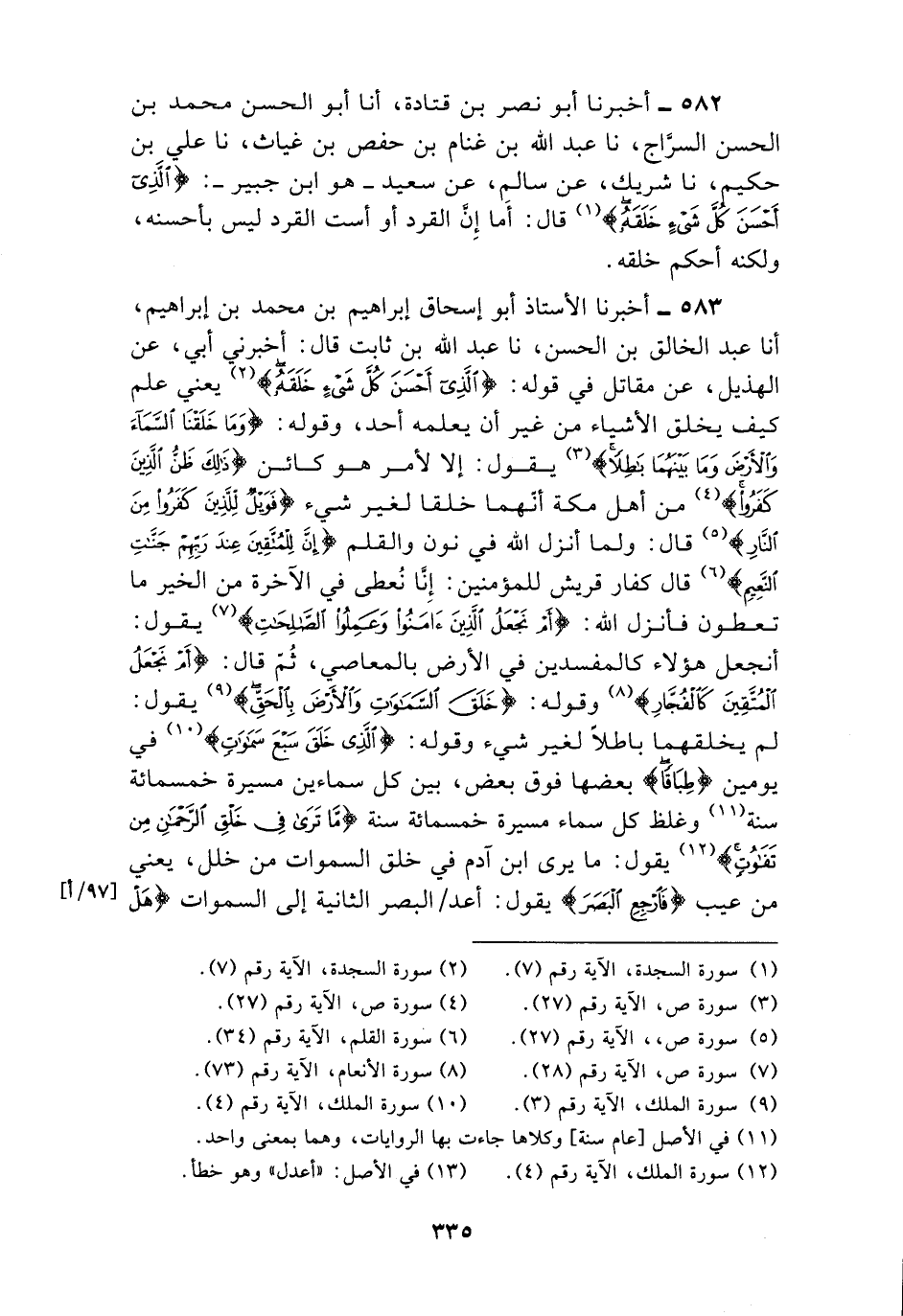582 - أَخْبَرَنَا أَبُو نَصْرِ بْنُ قَتَادَةَ , أنا أَبُو الْحَسَنِ مُحَمَّدُ بْنُ الْحَسَنِ السَّرَّاجُ , نا عَبْدُ اللَّهِ بْنُ غَنَّامِ بْنِ حَفْصِ بْنِ غِيَاثٍ , نا عَلِيُّ بْنُ حَكِيمٍ , نا شَرِيكٌ , عَنْ سَالِمٍ , عَنْ سَعِيدٍ هُوَ ابْنُ جُبَيْرٍ: {§الَّذِي أَحْسَنَ كُلَّ شَيْءٍ خَلَقَهُ} [السجدة: 7] قَالَ: «أَمَا إِنَّ الْقِرْدَ أَوِ اسْتَ الْقِرْدِ لَيْسَ بِأَحْسَنِهِ , وَلَكِنَّهُ أَحْكَمَ خَلْقَهُ»